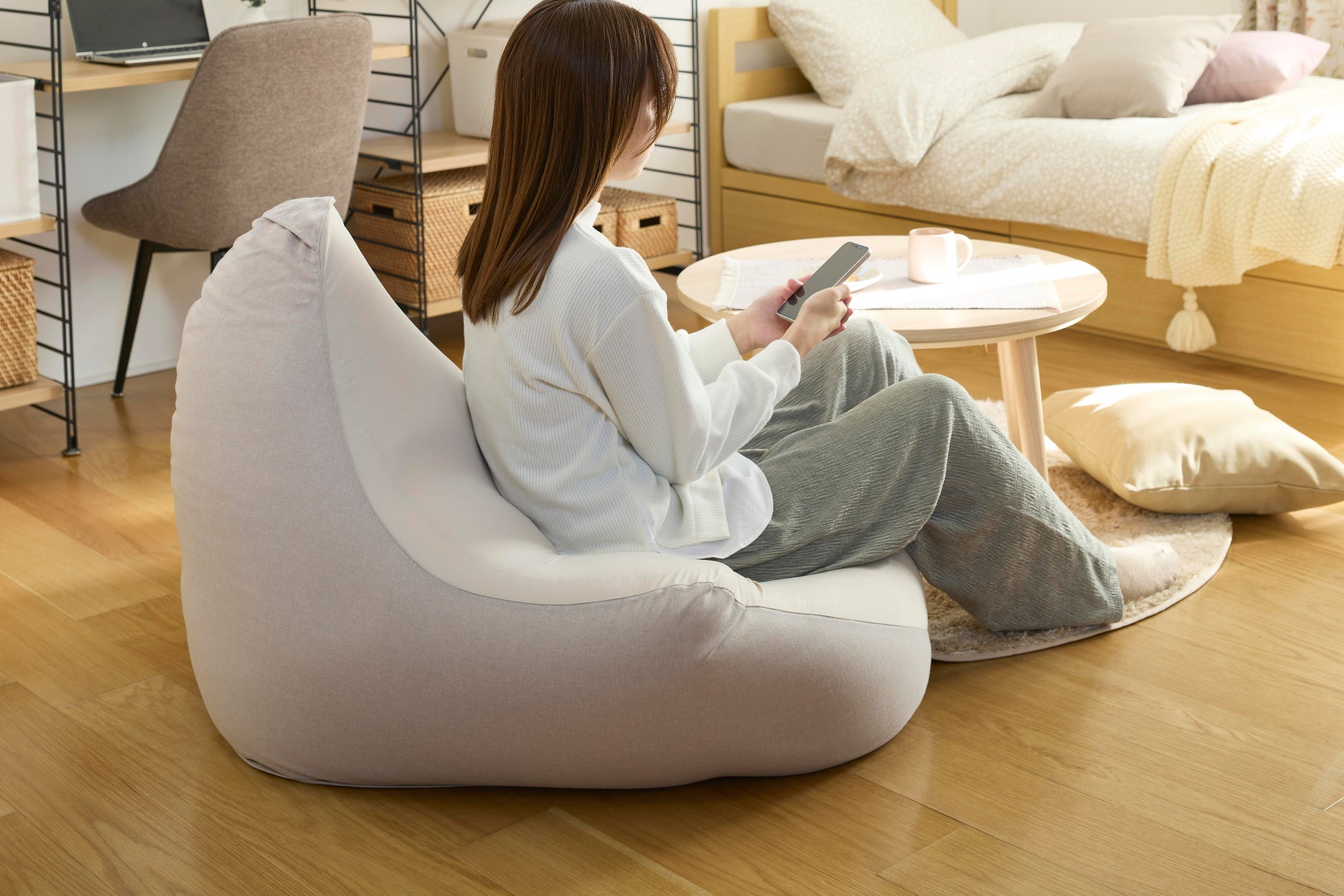 スマホを見ながらくつろげる、しっかりと包み込まれるフィット感あるビーズソファです。持ち手が付いているので、移動や掃除のときに持ち上げやすいです。カバーを取り外して洗濯ができるため、清潔に保てます。カバーはグレージュ、グレー、ネイビーの3色からお選びいただけます。
