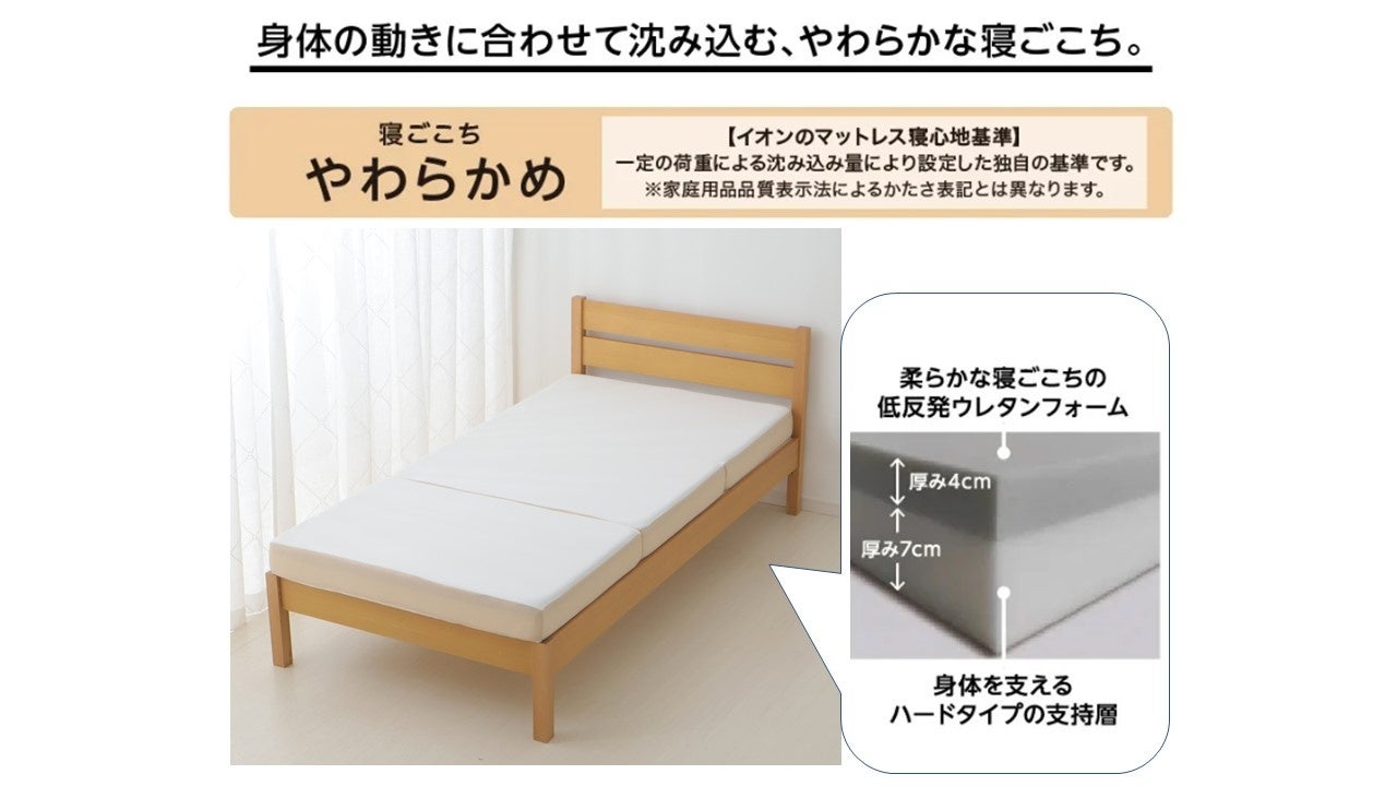 ふんわり包み込む(寝ごこち:やわらかめ):体の動きに合わせて沈み込む、柔らかな寝ごこち。