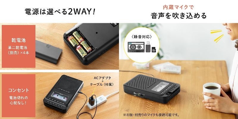 電源は単二乾電池×4本(別売)または付属のACコンセントの2通りで使用できます。マイクを内蔵しているの で、カセットテープに音声を吹き込むことができます。