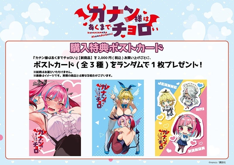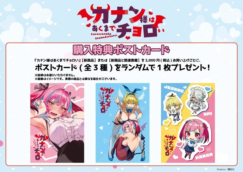期間中に会場内にて『カナン様はあくまでチョロい』【新商品】または【新商品と関連書籍】を2,000円(税込)お買い上げごとに、特典ポストカード(全3種)をランダムで1枚プレゼント!