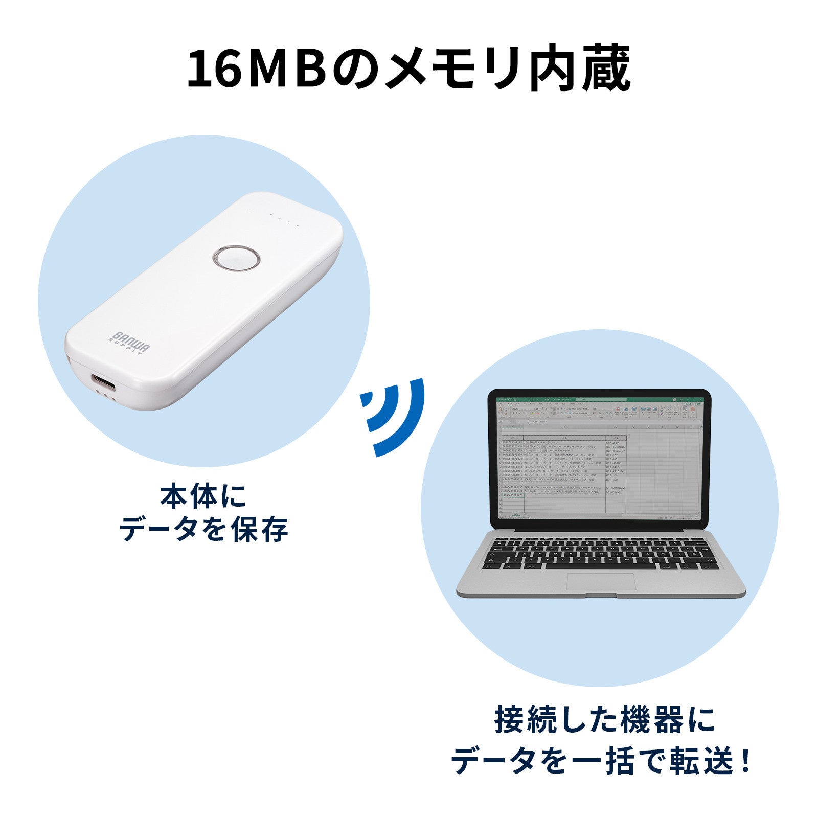 読み取ったバーコードのデータを本体に保存して、接続している機器に一括で転送することができます。