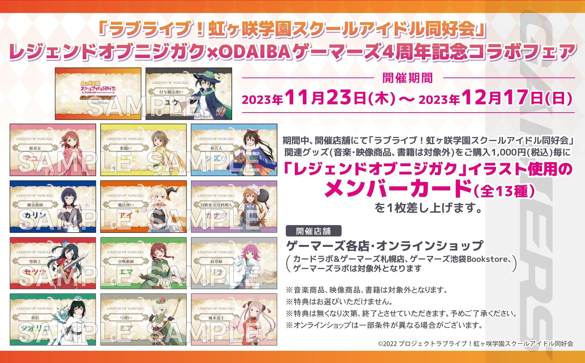 「ラブライブ!虹ヶ咲学園スクールアイドル同好会」レジェンドオブニジガク×ODAIBAゲーマーズ4周年記念コラボフェアを2023年11月23日(木)より開催致します!