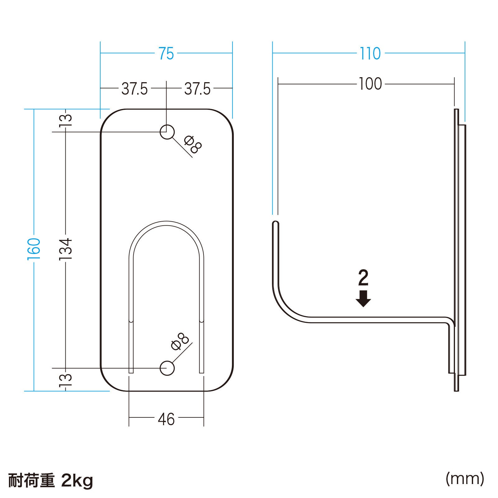 耐荷重2kgでしっかりとケーブルを支えます。フックサイズはW46×D100mmあり、太いケーブルにも対応しています。