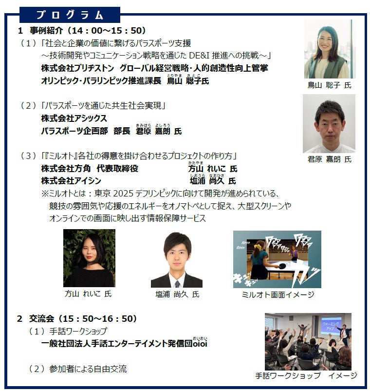東京2020パラリンピックをきっかけにパラスポーツに関わる企業や東京2025デフリンピックに向けて取組を展開している企業の好事例をご紹介します。また、他社とのネットワーク構築や情報交換ができる交流会も実施します。