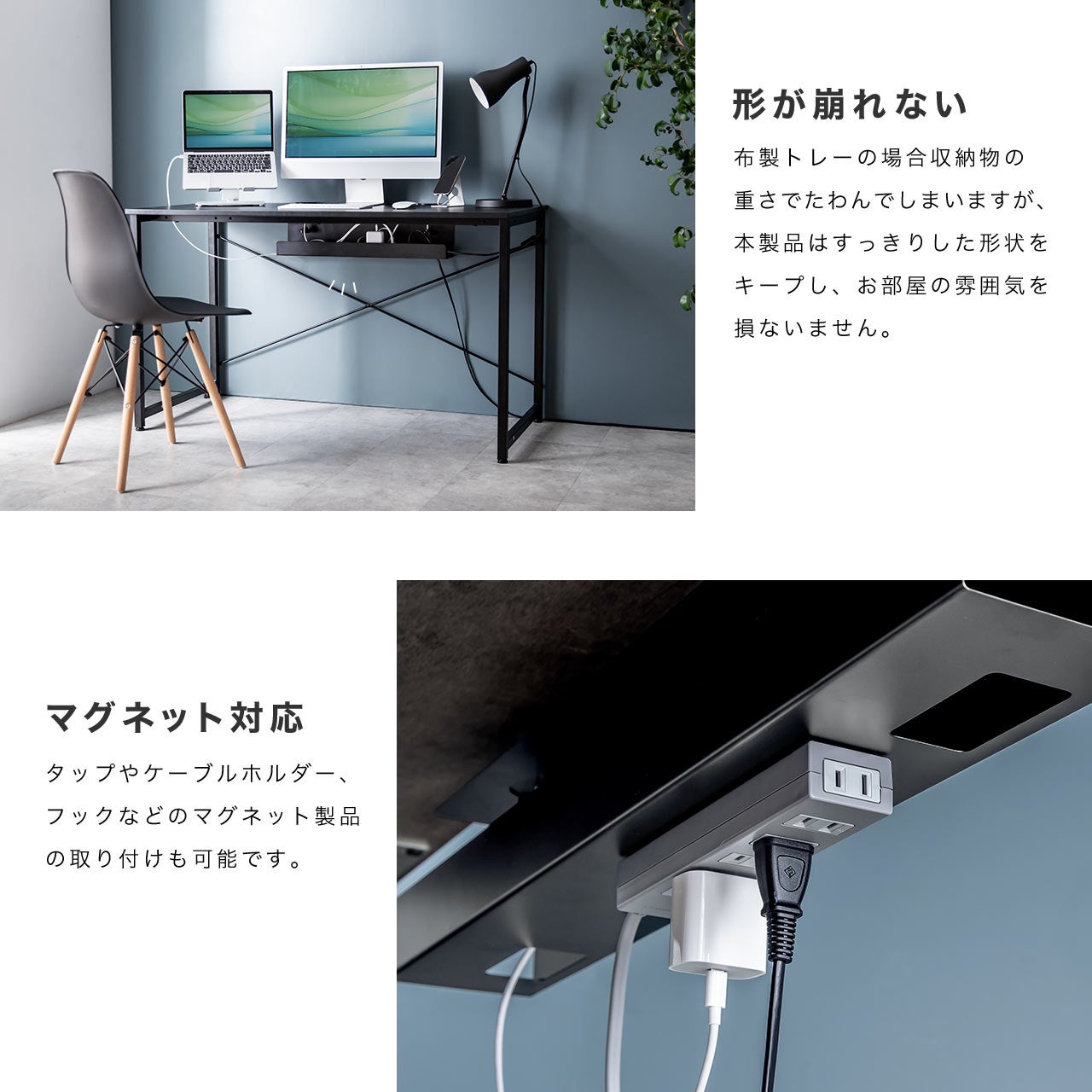 タップやケーブルホルダーなど、マグネット製品も取り付け可能なケーブルトレー。
