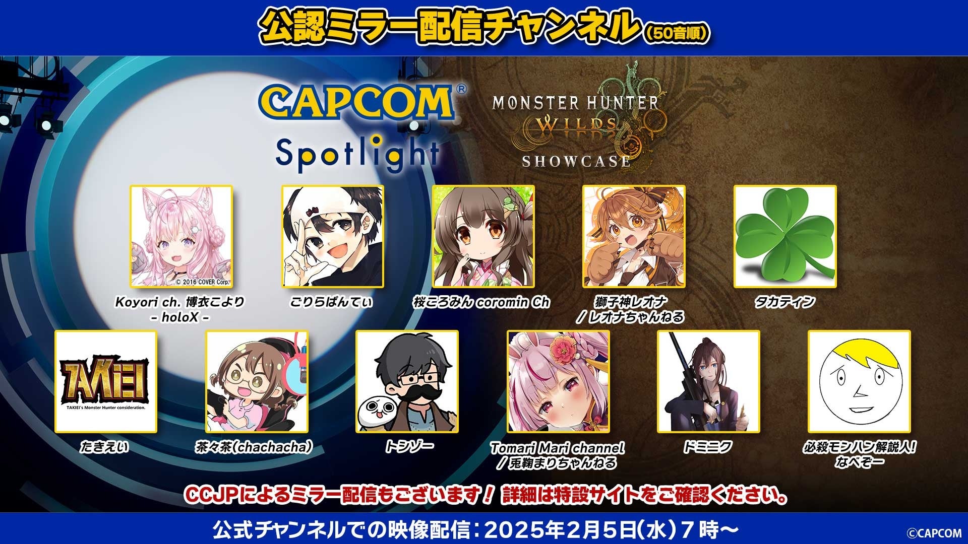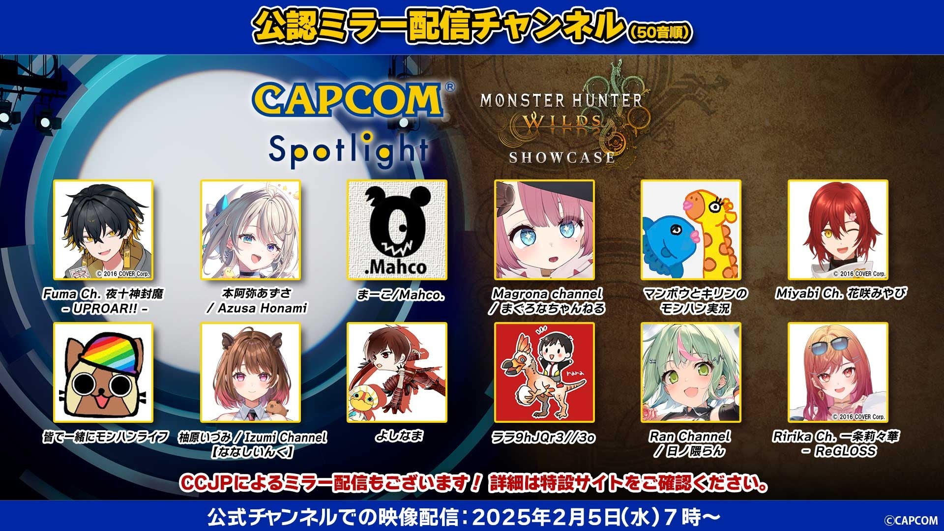 2025年2月5日(水)朝7時から配信される「カプコンスポットライト」と「モンスターハンターワイルズ ショーケース」の2本立て番組を、人気配信者の皆様と一緒に楽しめる公認ミラー配信チャンネルをご紹介! さらにCAPCOM Creators JPメンバーの皆様によるミラー配信も! お気に入りの配信者の方と「カプコンスポットライト」と「モンスターハンターワイルズ ショーケース」を楽しもう!