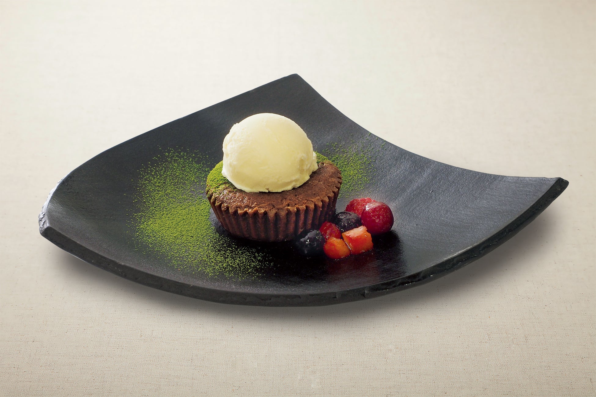 温かいフォンダンショコラに冷たいバニラアイスの二重奏。濃厚なショコラに、ベリーの甘酸っぱさ、抹茶の苦味がアクセントに。