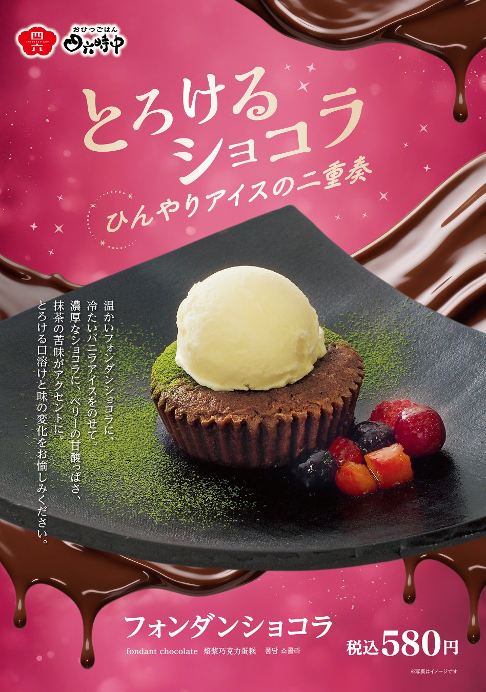 全国のイオンなどのショッピングセンターでレストラン「四六時中」を展開する株式会社イオンイーハート(所在地:千葉県千葉市、代表取締役社長:奥野善德)は、バレンタインの季節にぴったりの、とろける「フォンダンショコラ」を『おひつごはん四六時中』にて、1月29日(水)より販売いたします。