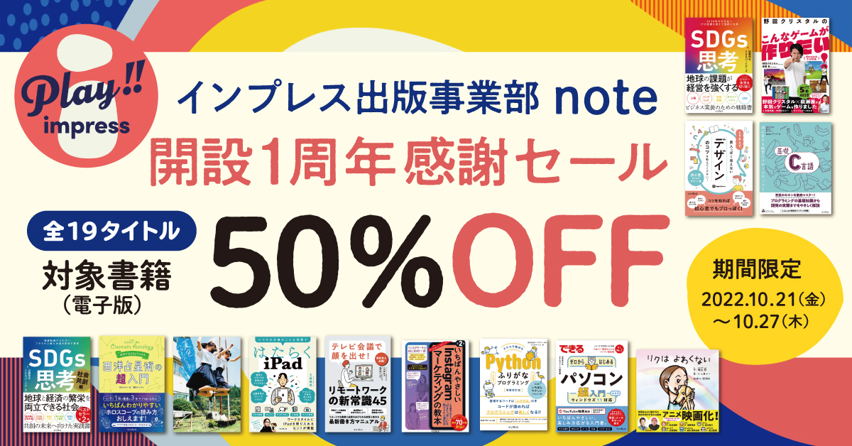 インプレスグループでIT関連メディア事業を展開する株式会社インプレス(本社:東京都千代田区、代表取締役社長:小川 亨)は、当社の出版事業部が運営する公式noteの開設1周年を記念した電子書籍50%OFFキャンペーンを2022年10月21日(金)から10月27日(木)まで実施します。