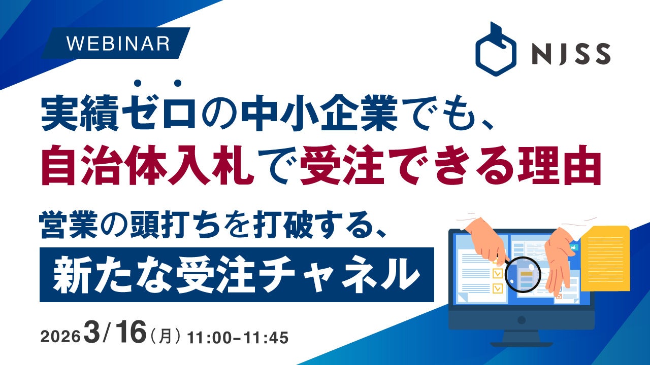 本セミナーでは、公共入札の基本・流れ・コツを実践的に解説します。資格取得から入札・落札までの5ステップに加え、参入したものの成果が出ない企業に共通する「5つの失敗パターン」とその回避策もお伝えします。また、全国8,900以上の機関の入札情報を一括検索できる「NJSS」を活用した効率的な案件探しと競合分析の方法もご紹介します。営業の頭打ちを打破し、新たな受注チャネルを開拓したい方は、ぜひご参加ください。