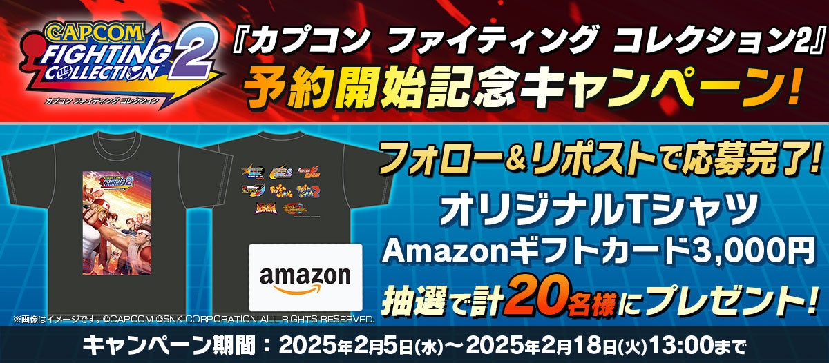 『カプコン ファイティング コレクション2』の予約開始を記念して、抽選で合計20名様にオリジナルTシャツ、Amazonギフトカード3,000円が当たるキャンペーンを開催!