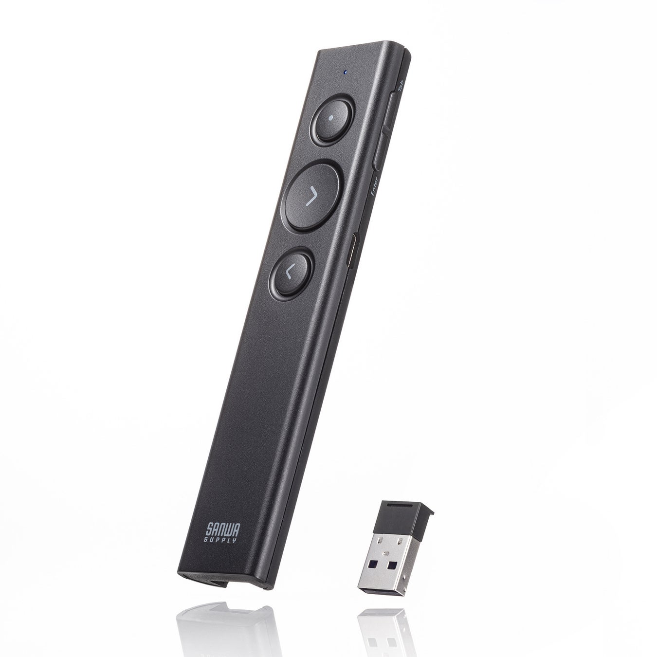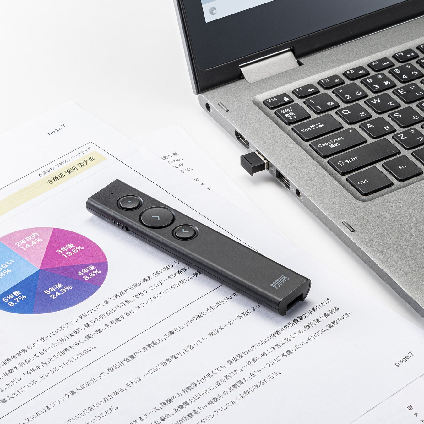 PowerPointやKeynoteに対応しており、パソコンを使ってプレゼンするときにレーザー照射の他、簡単なパソコン操作もできます。USBレシーバーは専用ドライバー不要の簡単接続です。