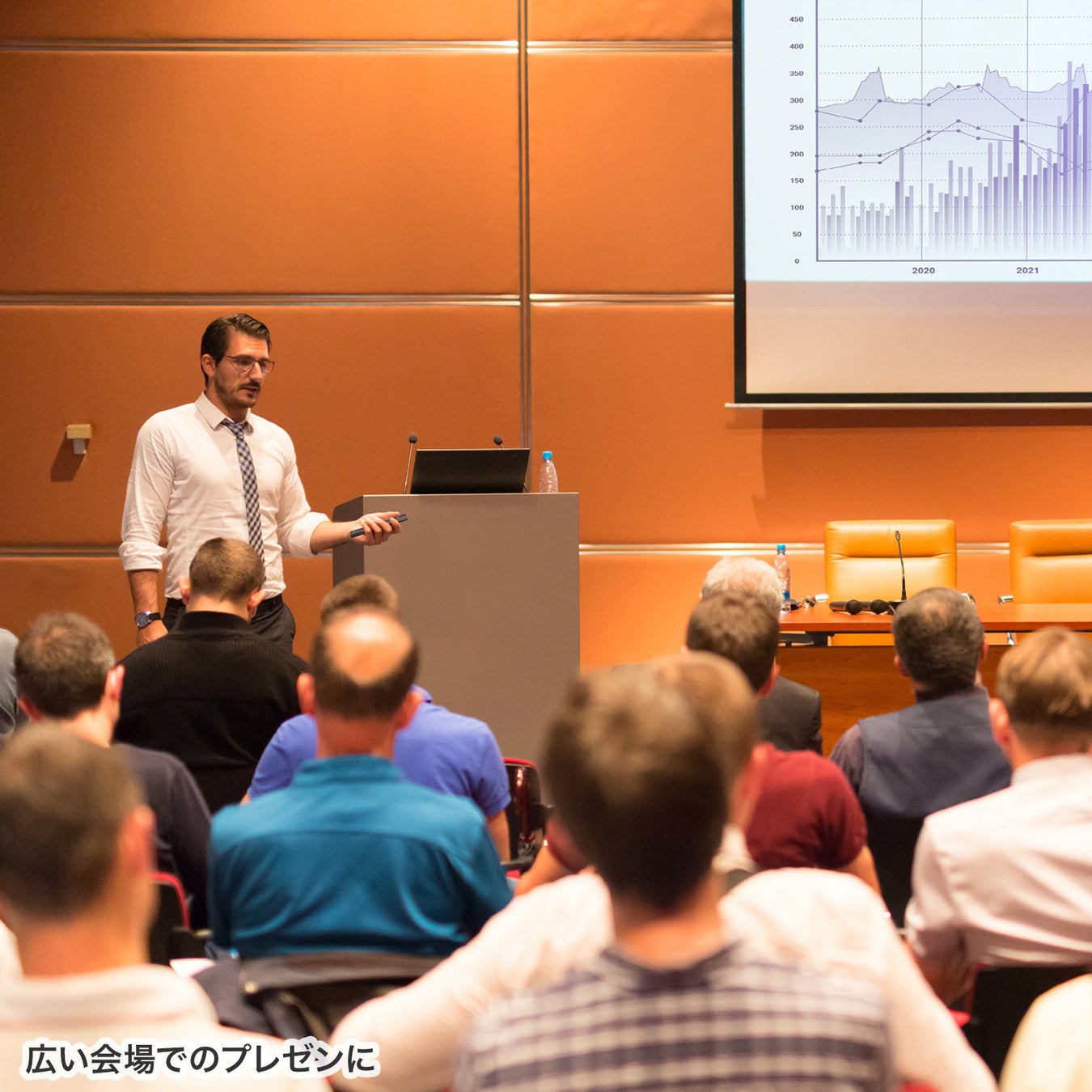 赤色のレーザー光線が約100m先まで照射できます(夜間時)。広い会場でも動きながら快適にプレゼンできます。