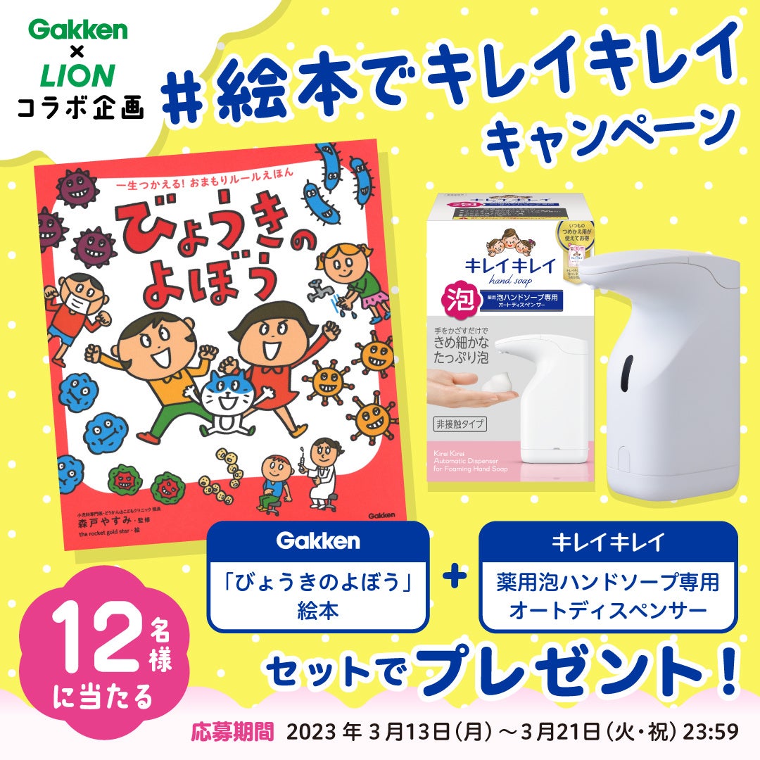 株式会社 学研ホールディングス(東京・品川/代表取締役社長:宮原博昭)のグループ会社、株式会社 Gakken(東京・品川/代表取締役社長:五郎丸徹)は、2023年3月13日(月)~3月21日(火・祝)まで、Twitter・Instagramにて、Gakkenの絵本『一生つかえる!おまもりルールえほん びょうきのよぼう』とLION「キレイキレイ薬用泡ハンドソープ専用オートディスペンサー」が当たる #絵本でキレイキレイ キャンペーンを開催します。