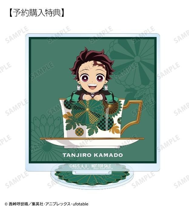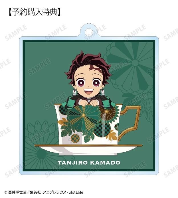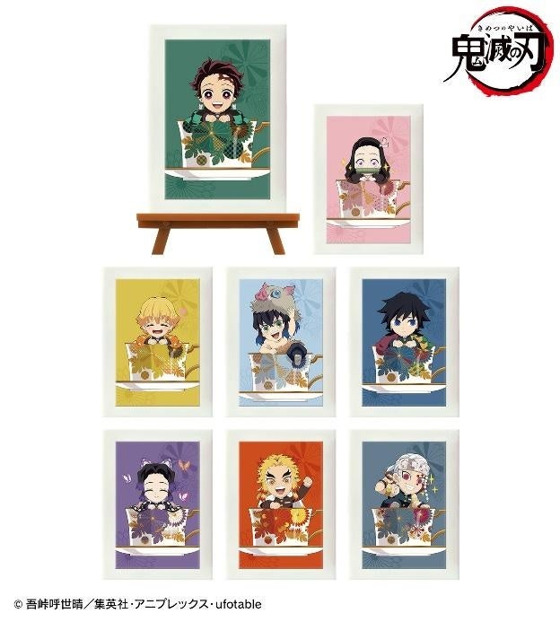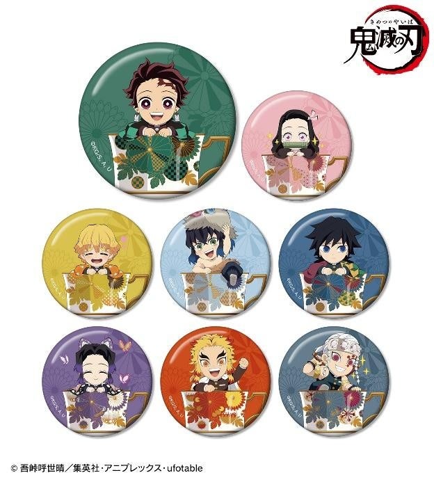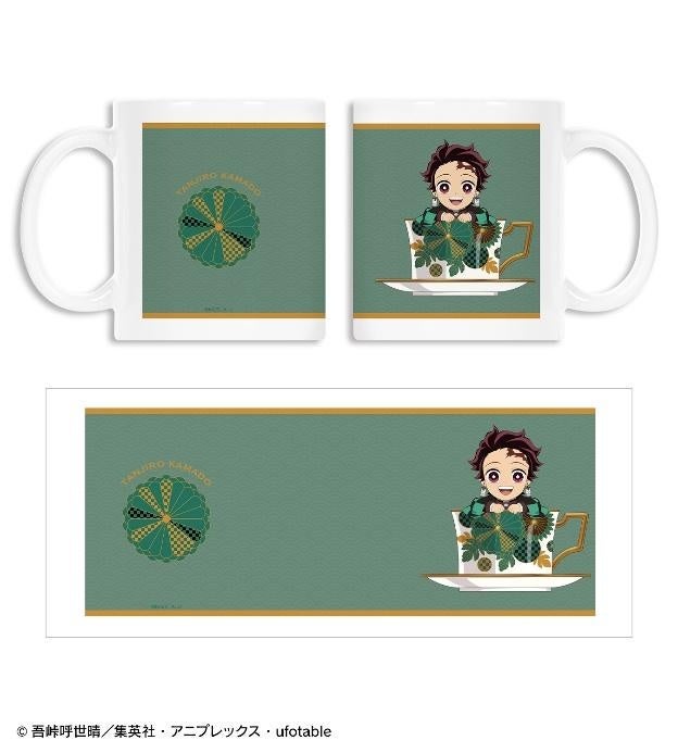 ティーカップに入った竈門炭治郎、竈門禰󠄀豆子、我妻善逸、嘴平伊之助、冨岡義勇、胡蝶しのぶ、煉󠄁獄杏寿郎、宇髄天元のufotable描き下ろしイラストを使用してデザインしました。