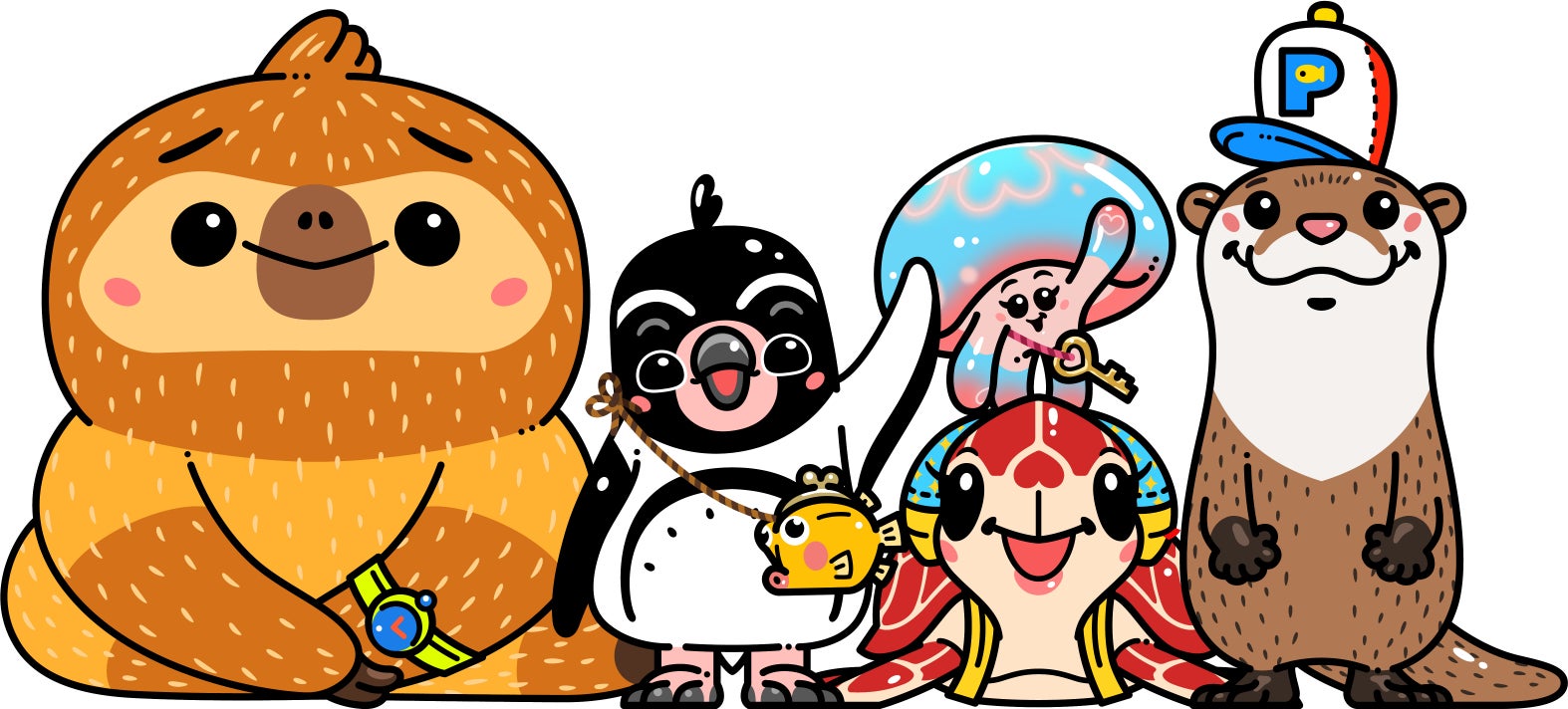 館内の人気者・フンボルトペンギンのキャラクター「ぺタタ」は、水族館で生まれ育ったフンボルトペンギン。いつもガラス越しに笑顔で見守ってくれるお客様が大好きで、「もっとたくさんの人を笑顔にしたい」という思いから、水槽の外へ“仲間探しの冒険”に出かけます。館内を歩き回るぺタタは、旅の途中でナマケモノの「ノロロ」、カワウソの「パタタ」、クラゲの「キララ」、ウミガメの「ユララ」と出会います。みんなに想いを共有することで新たな仲間として迎え入れます。こうして結成されたのが、笑顔を届けるチーム「TEAM SMILE HAPPY!」です。