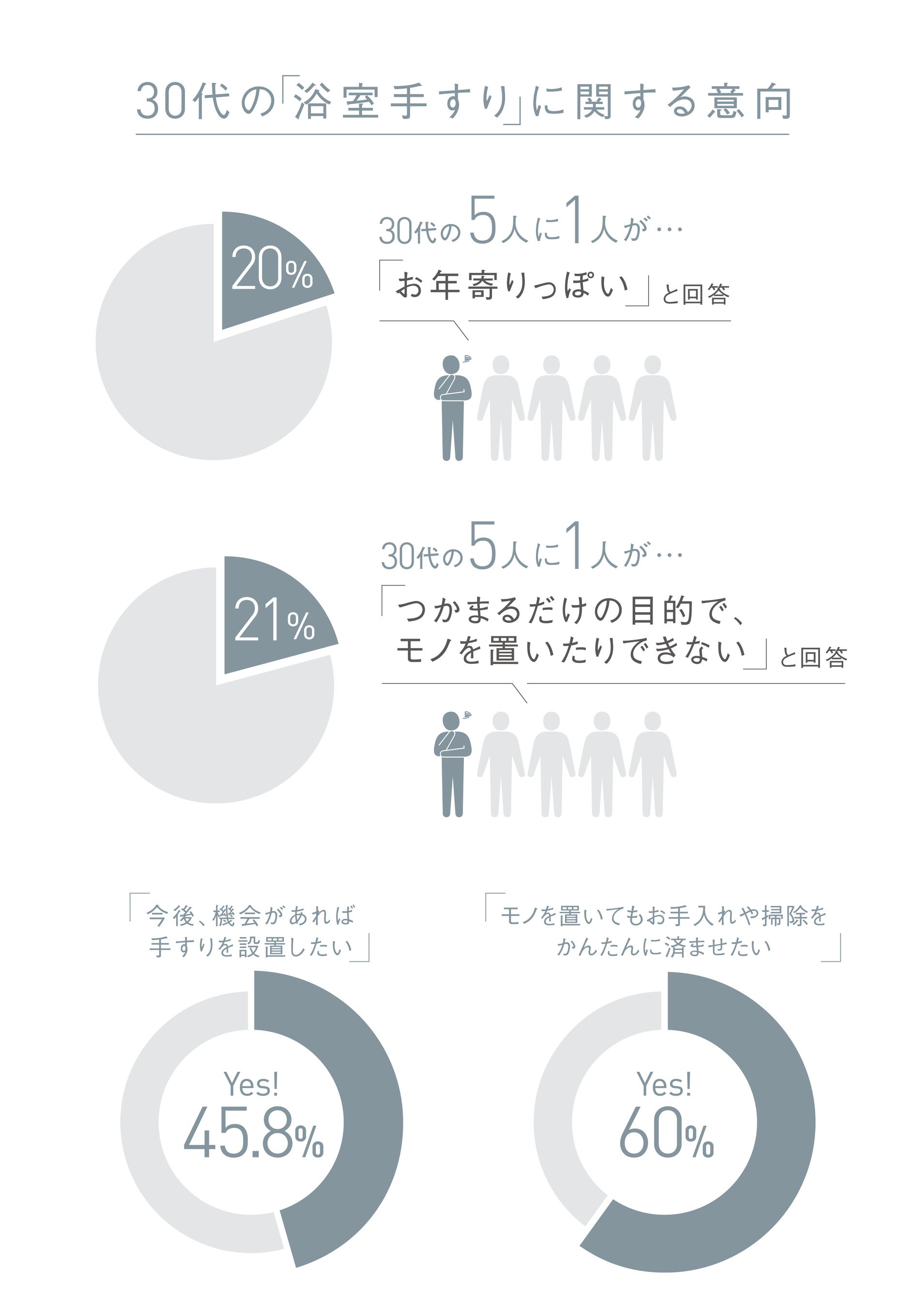 浴室手すりのデザインについての調査では、30代で「お年寄りっぽい(20%)」「つかまるだけの目的で、モノを置いたりできない(21%)」という回答がある一方、設置していないことに不安を感じている方も一定数いました。また、手すり非設置者の中には「今後、機会があれば手すりを設置したい(45.8%)」という意向があります。その他、清掃性については、60%の方が「モノを置いてもお手入れや掃除をかんたんに済ませたい」と回答しています。