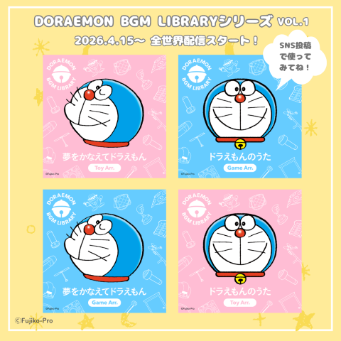 「ドラえもん」のBGMシリーズ「DORAEMON BGM LIBRARY」が本日より全世界配信スタート!第一弾として「ドラえもんのうた」「夢をかなえてドラえもん」の2曲を、ピアノ・木琴・トイ楽器等の柔らかな音色で可愛らしくアレンジした〈TOY Arr.〉、ポップで遊び心のある電子音でゲーム風にアレンジした〈GAME. Arr.〉の各2タイプを4/15(水)より配信開始する。「ドラえもん」の公式イベント等でも使用される他、公式音源としてSNSユーザーが楽しめるよう、映像に合わせやすいアレンジとなっている。「DORAEMON BGM LIBRARY」は各SNSにも公式音源として追加されるので、投稿の際に是非この公式音源を使ってみよう!