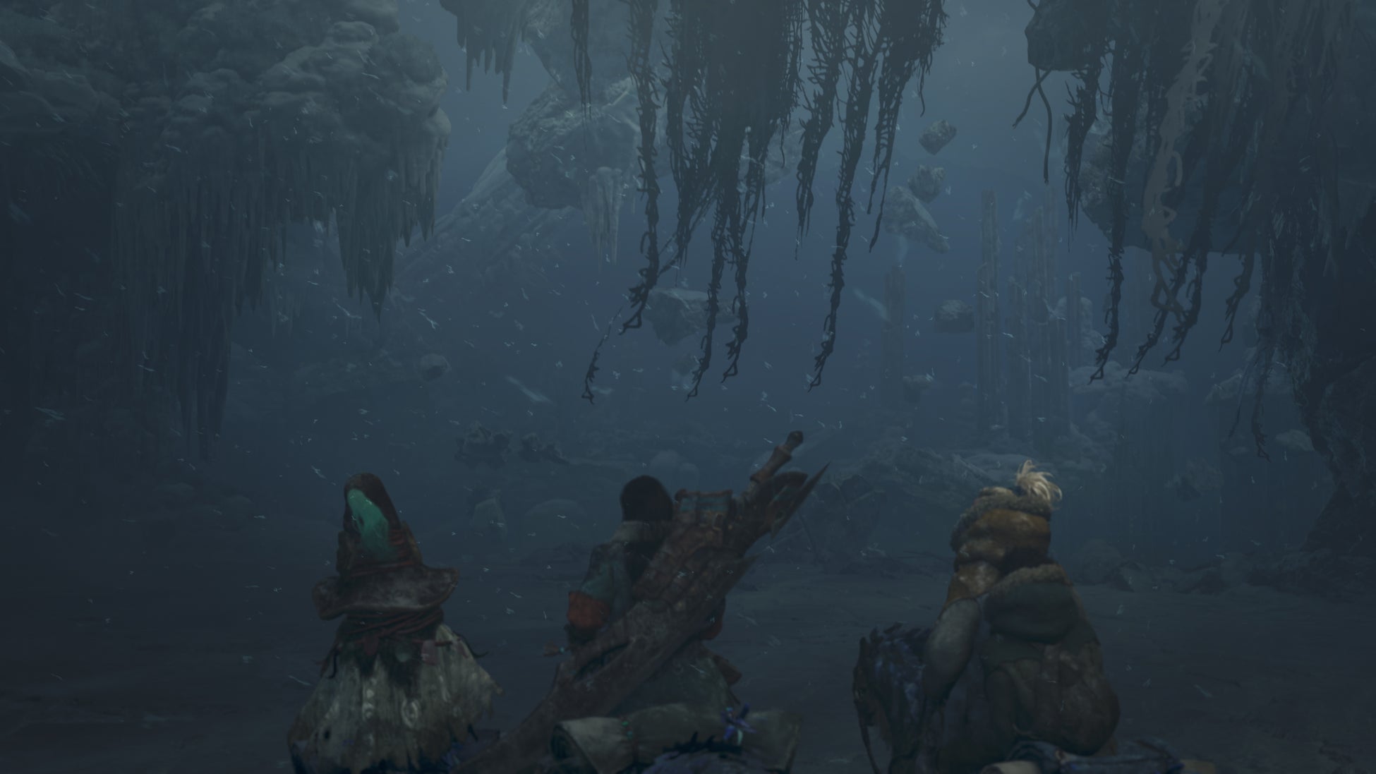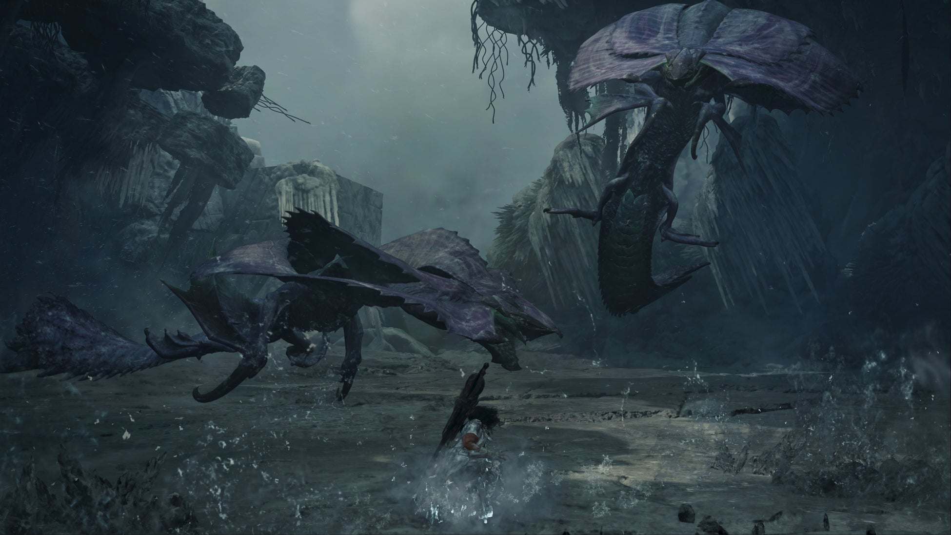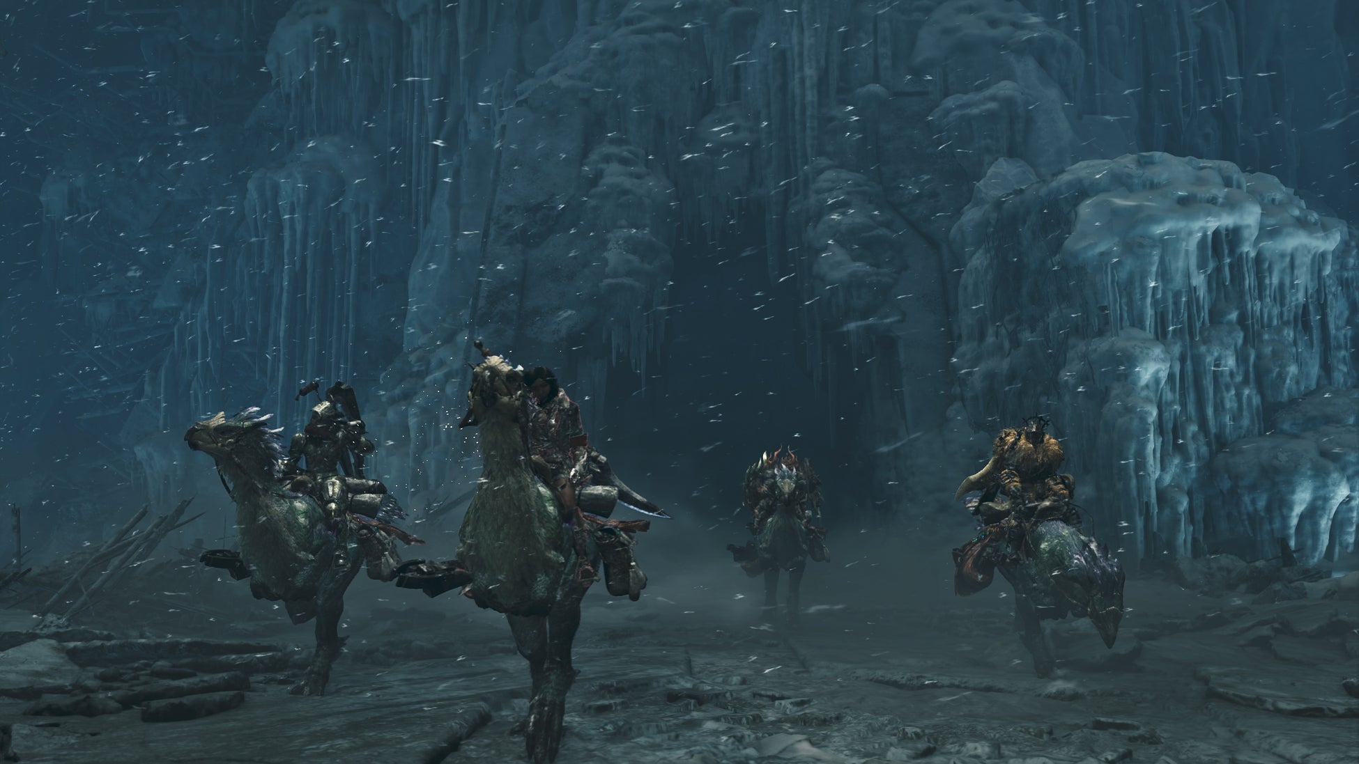 氷霧が漂う中、頭上では凍てつくような風に何かがたなびき、崩落した瓦礫なども目にすることができる、独特なエリアを形成しています。