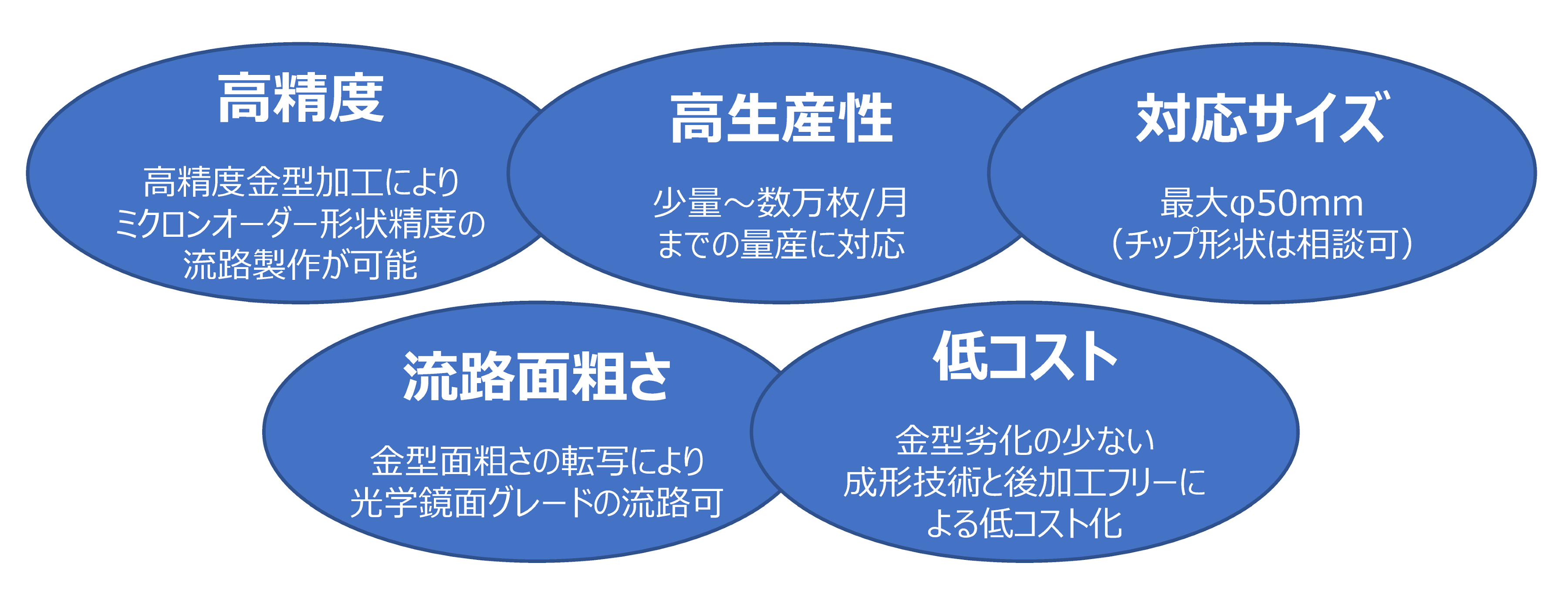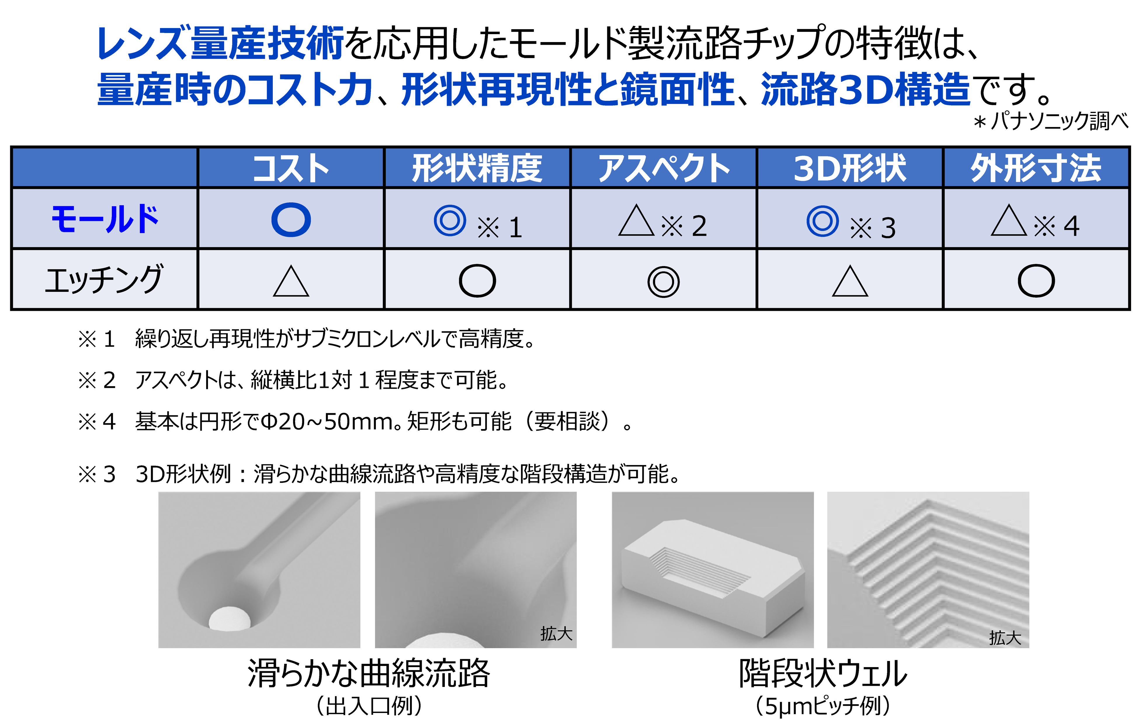 耐環境性、耐薬品性などの特長を有するガラス製マイクロ流路チップは、室外や厳しい環境下における分析や検査等のディスポーザブルデバイス、各種薬品の合成・反応・検査用デバイスとして期待されています。パナソニックでは、ガラスモールド工法によるガラス製マイクロ流路チップ量産化技術を開発しました。従来の製造方法の主流であるエッチングや機械加工では困難であった高生産性と低コスト化を実現しています。主な技術や特徴は、以下となります。