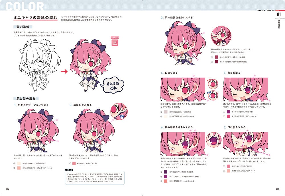 基本の描き方からはじまり、表情・ポーズ・ファッションのバリエーション、色の塗り方まで、さまざまなテクニックを学ぶことができます。