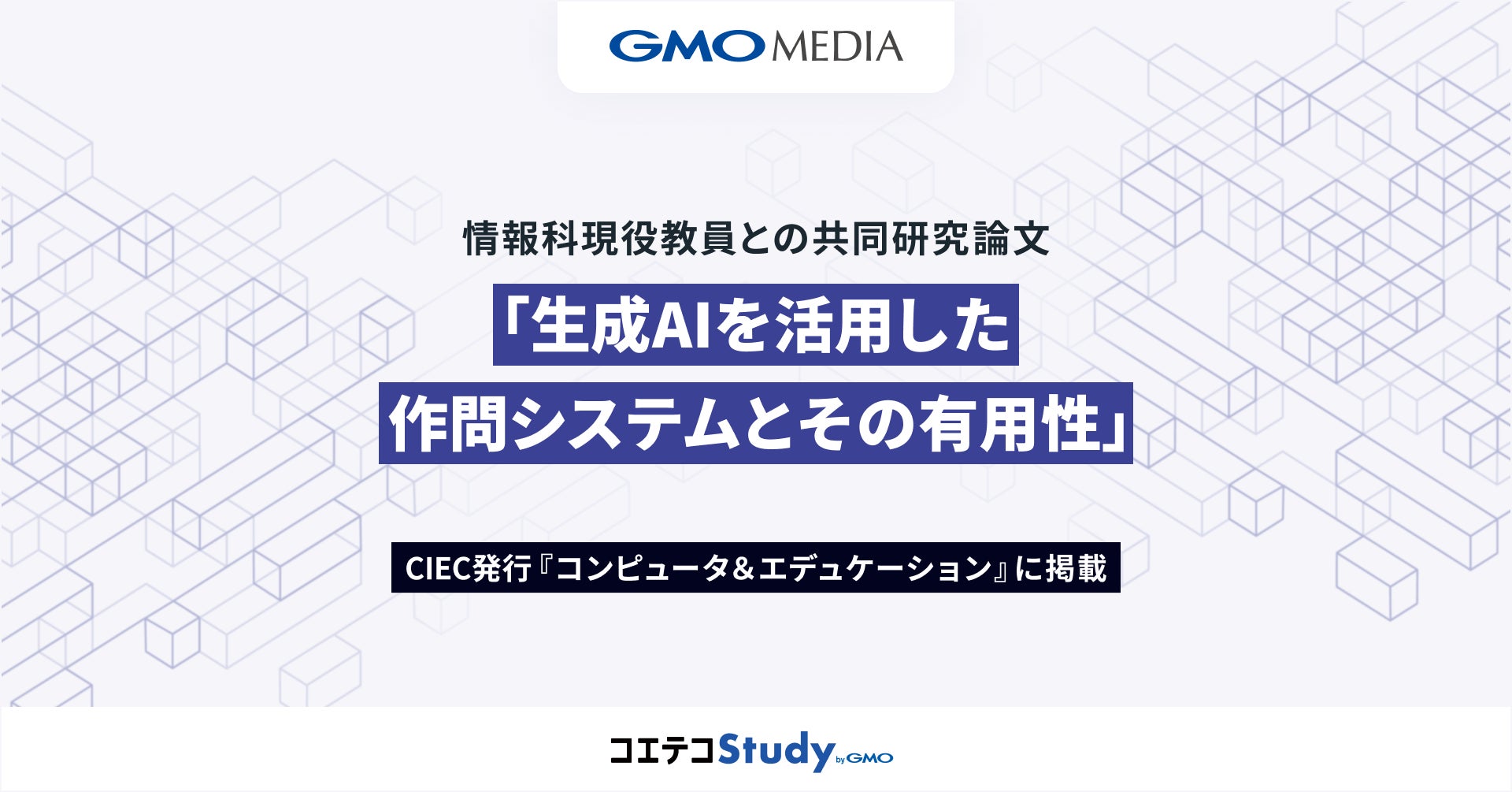 GMOインターネットグループのGMOメディア株式会社(代表取締役社長:森 輝幸 以下、GMOメディア)は、高校教員向け簡単課題作成サービス「コエテコStudy byGMO」を活用した共同研究論文「生成AIを活用した作問システムとその有用性」を発表しました。