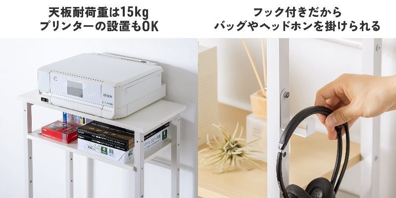 天板耐荷重は15kgでプリンタを置くことができます。フック付きで、バッグやヘッドホンをかけることができます。