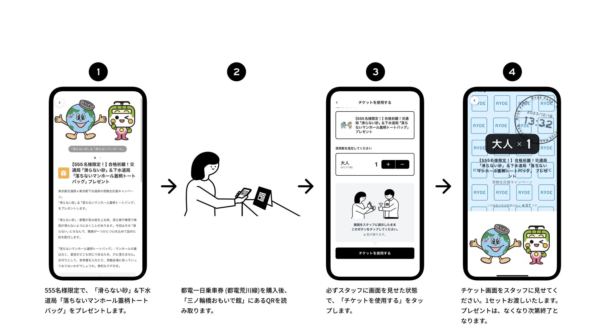 RYDE株式会社が提供するモビリティプラットフォームアプリ「RYDE PASS」にて、「東京さくらトラム(都電荒川線)デジタル乗車券(大人400円、小児200円)」を購入いただいた方、先着555名様限定で「滑らない都電の砂」&「落ちないマンホール蓋柄トートバッグ」を贈呈します。