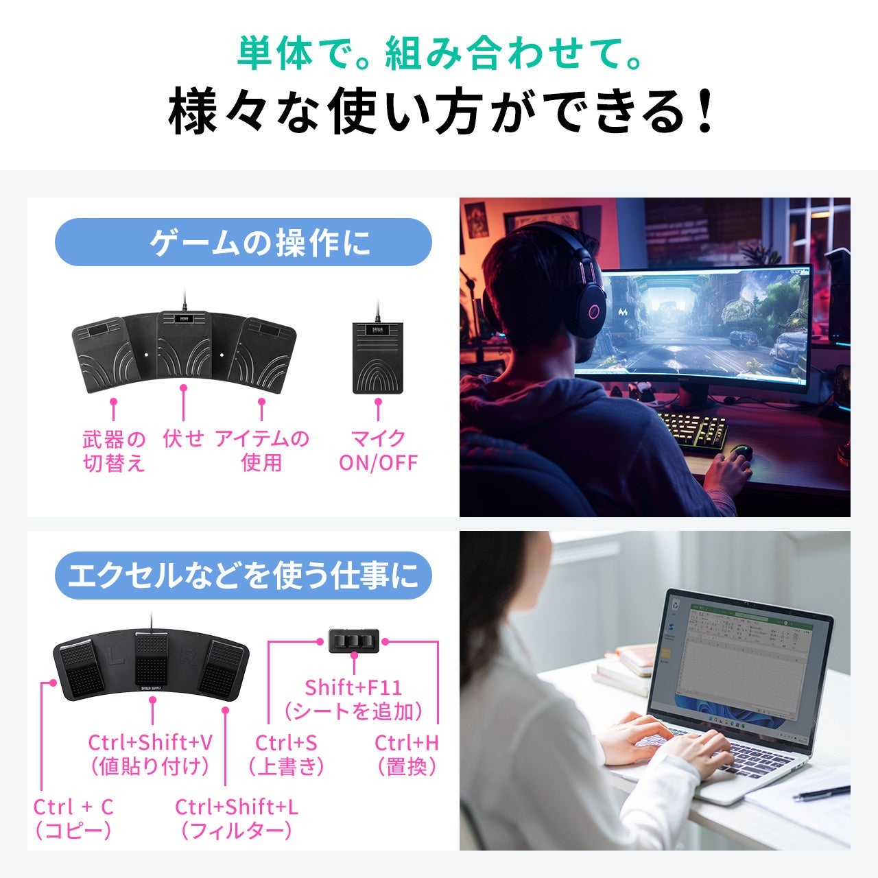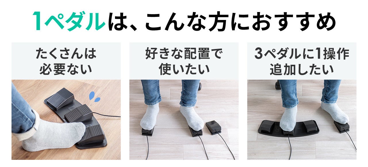 1ペダルタイプは、たくさんペダルは必要ない方や、好きな配置で使いたい方、3ペダルに1操作を追加したい方、とりあえずフットペダルを試してみたい方におすすめです。