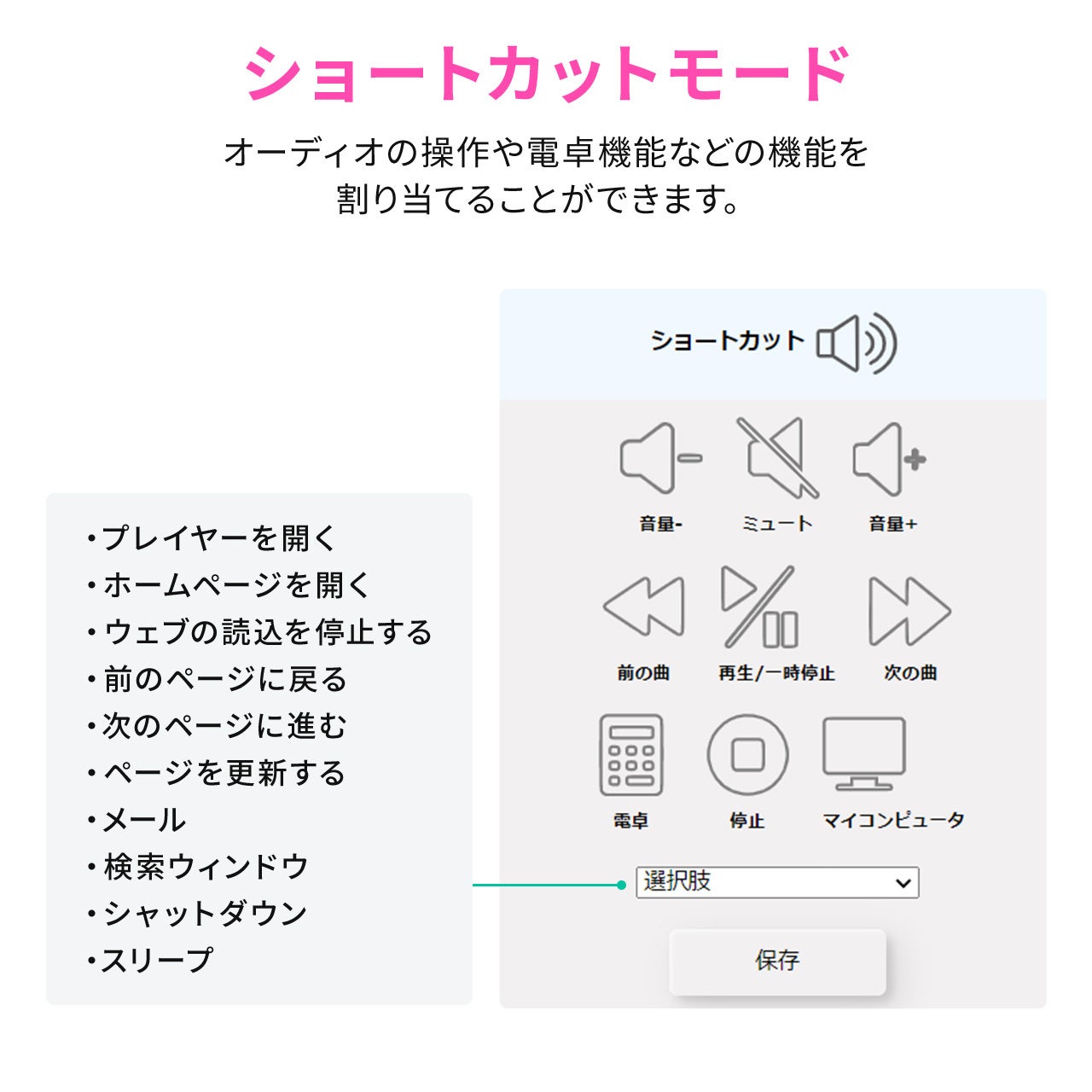 キーボードのショートカット(複数キーの同時押し)や文字列を割り当て可能です。