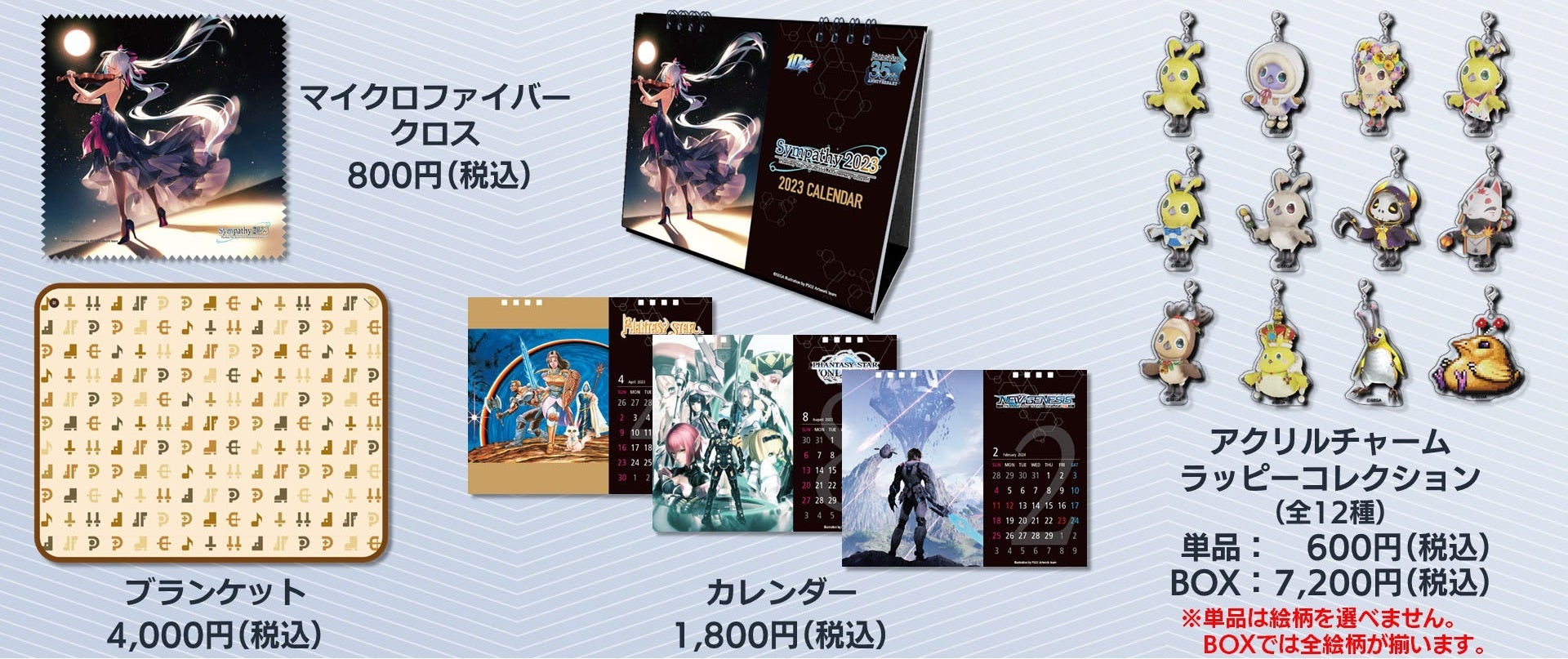 胸元にマトイのシルエットが入ったTシャツや、美麗なキービジュアルのB2タペストリー、記念イラストを使用したクリアファイル2枚セットや、『ファンタシースター』シリーズ35年の歴史を凝縮した魅力あるイラストが満載の卓上サイズのカレンダーなど、「シンパシー2023」をイメージしてデザインされたアイテムが多数登場します。