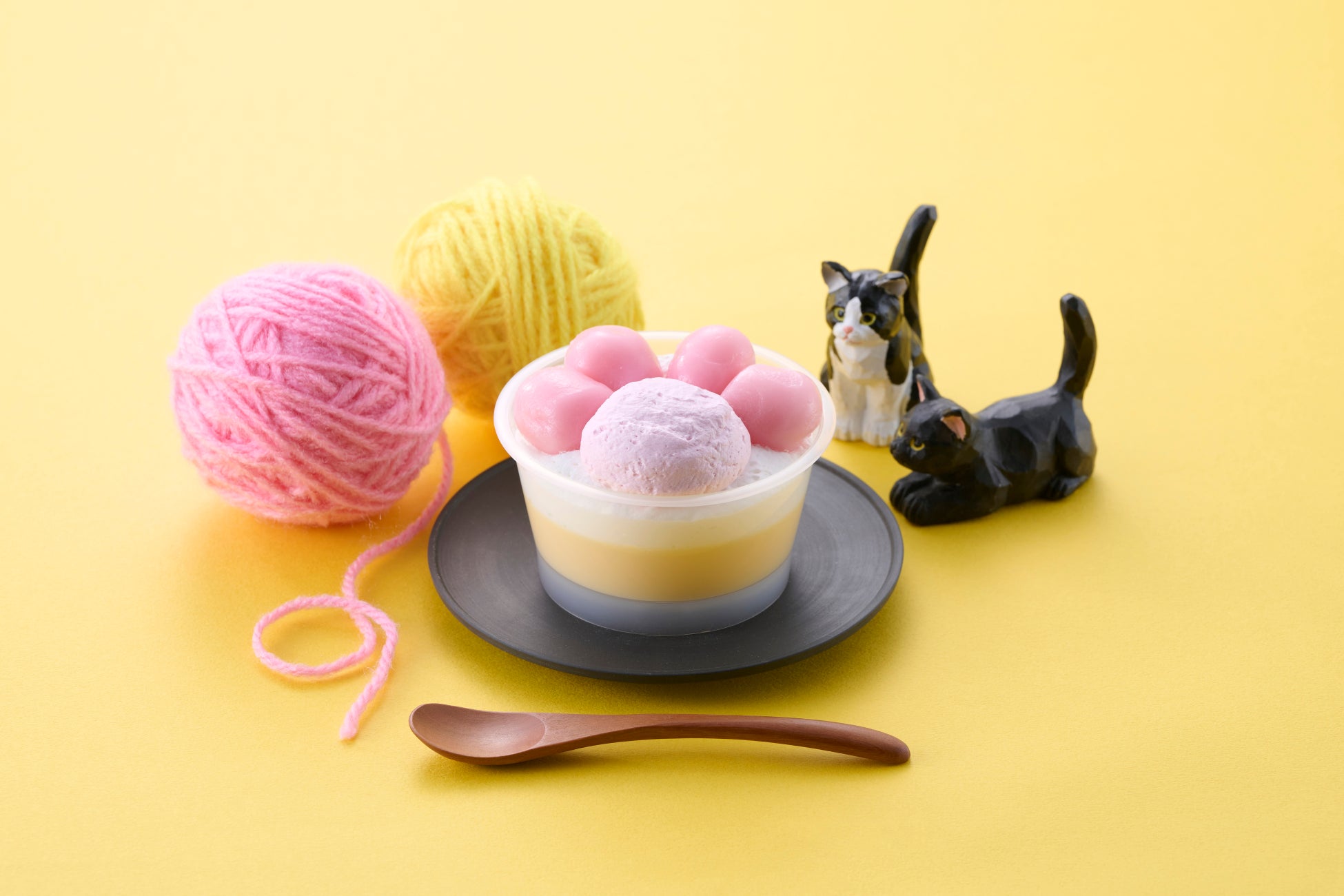 ねこの肉球をイメージした商品の登場です。なめらかに蒸しあげたプリンの上に、ホイップクリームを絞り、ピンク白玉を4個トッピングし、いちごホイップクリームを絞り、ついつい見てしまう形状に仕立てました。