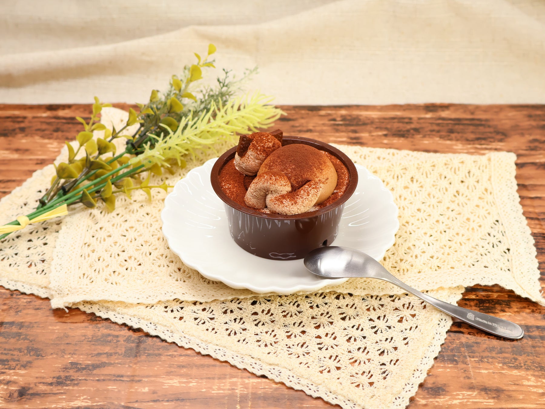仕上げにココアパウダーをかけて、丸まった黒猫を表現したかわいらしいパフェに仕上げています。