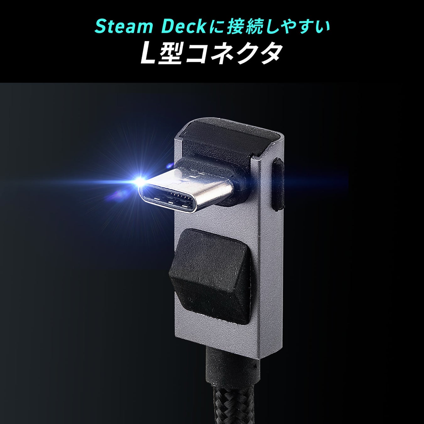 コネクタはL字型になっているため、ポータブルゲーミングPCとの接続がスムーズです。ケーブルが邪魔にならず、スペースを有効活用できます。また、ナイロンメッシュ素材のケーブルは耐久性に優れているので、長期的な使用にも安心です。