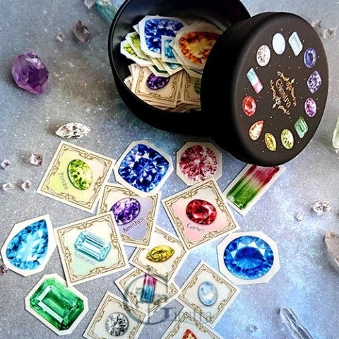 宝石イラストのフレークシールが入ったミニサイズの丸缶です。