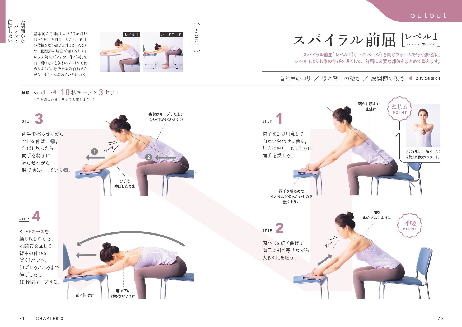 「ねじる」「伸ばす」「呼吸」の3つの力を使って、背中で合掌・前屈・後屈・開脚の4つのポーズを行い、美しい姿勢を手に入れる事ができます。