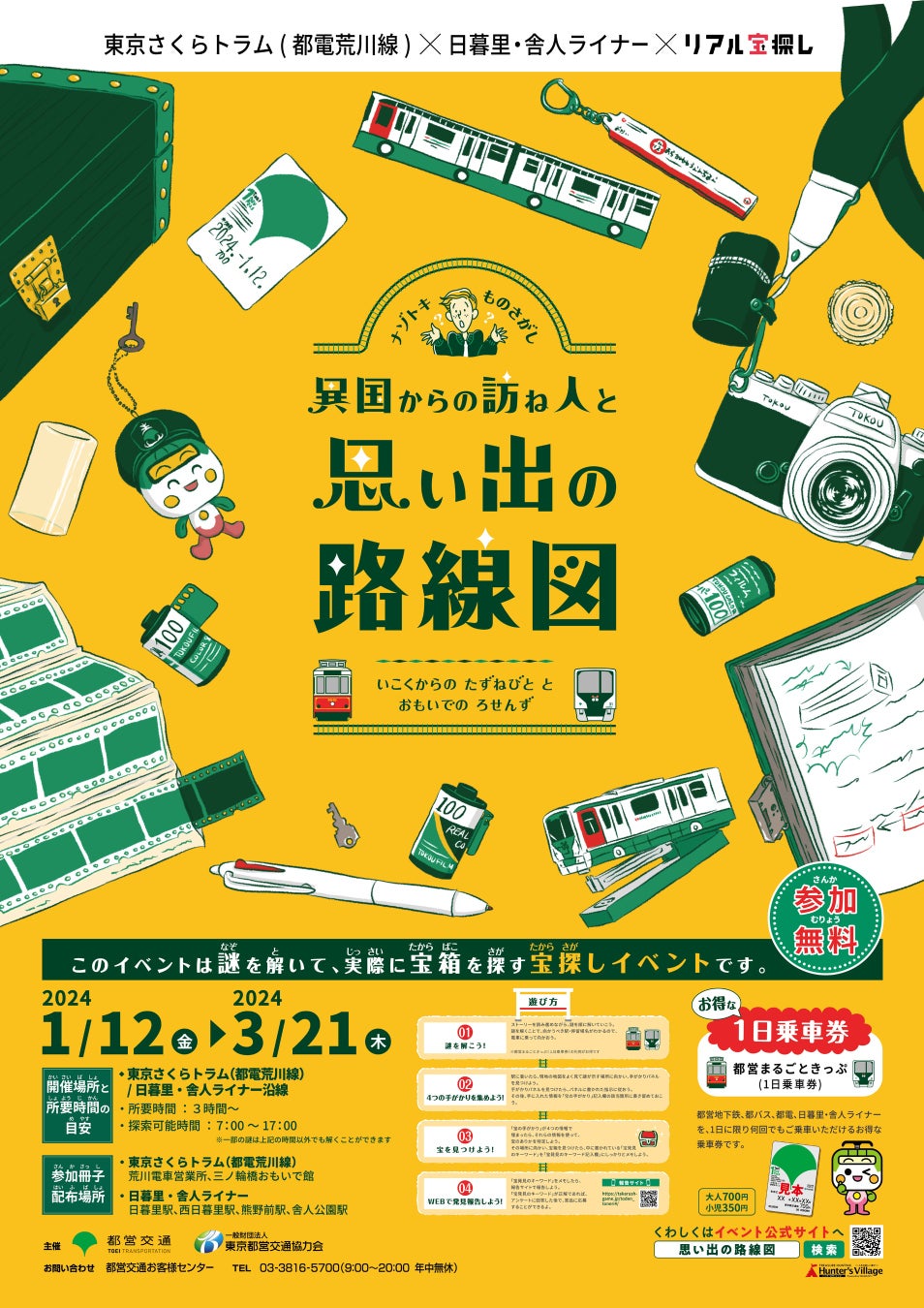 東京都交通局では、東京さくらトラム(都電荒川線)×日暮里・舎人ライナー×リアル宝探し「異国からの訪ね人と思い出の路線図」を、令和6年1月12日(金)から令和6年3月21日(木)まで実施します。