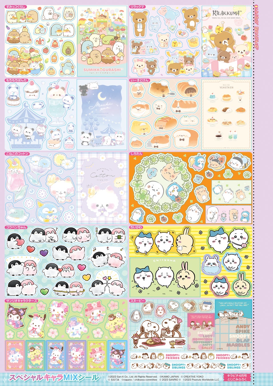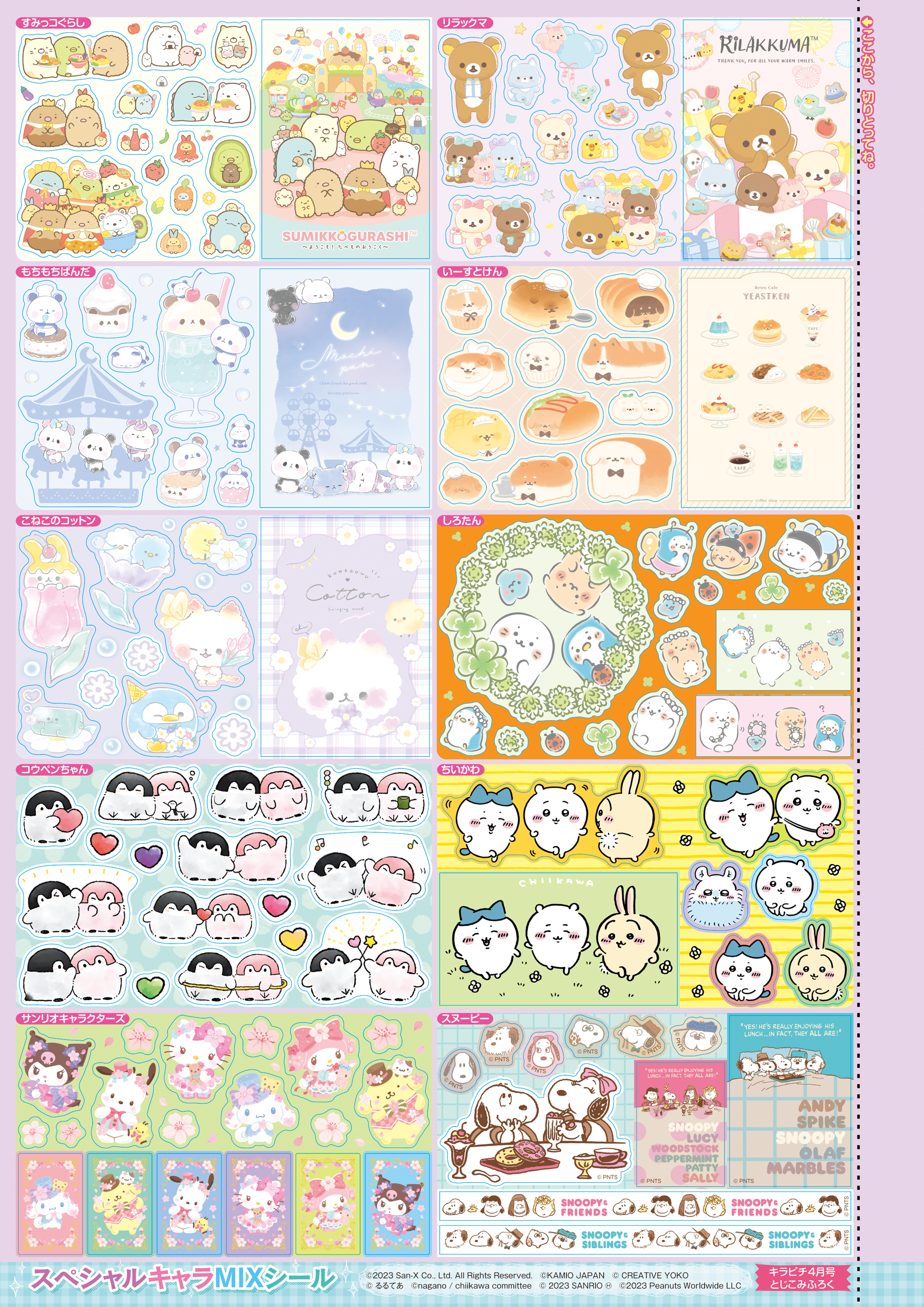 今号のキャラMIXシールはすみっコぐらし、リラックマ、もちもちぱんだ、いーすとけん。、こねこのコットン、しろたん、コウペンちゃん、ちいかわ、サンリオキャラクターズ、スヌーピーの全10キャラクター!
