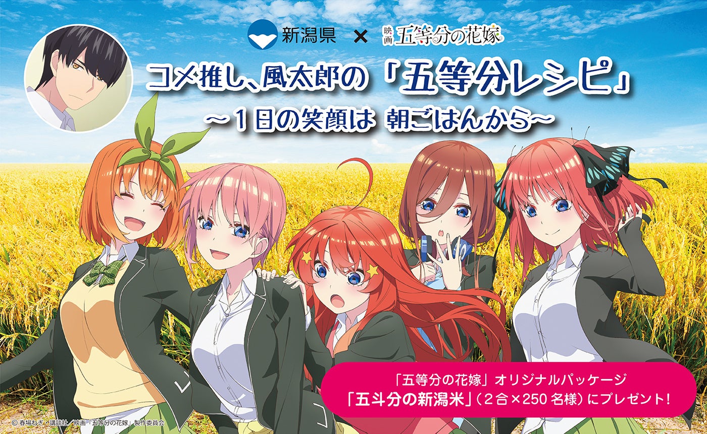講談社原作の大人気アニメ作品『映画 「五等分の花嫁」』と新潟県とのコラボレーションキャンペーンがスタート!独居する若年層の「親離れ=米離れ」を防ぐため、10代後半からの、幅広い若年層に支持されている、『映画「五等分の花嫁」』とのコラボレーションキャンペーンを2月14日より実施します。