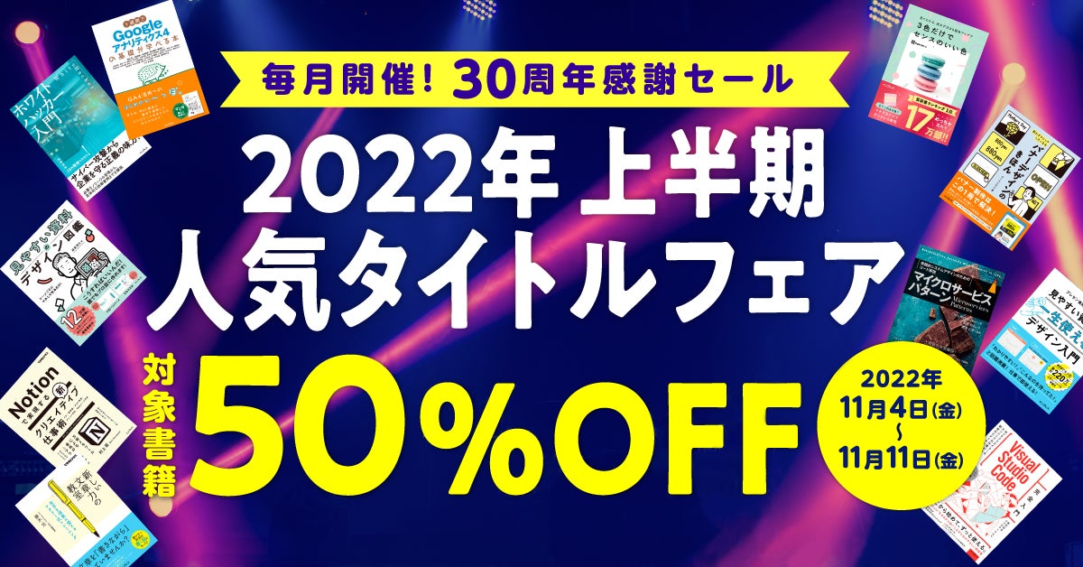 インプレスグループでIT関連メディア事業を展開する株式会社インプレス(本社:東京都千代田区、代表取締役社長:小川 亨)は、2022年のインプレスグループ創設30周年を記念した電子書籍のセール「毎月開催! 30周年感謝セール」を実施しています。その第5弾として「2022年上半期 人気タイトルフェア」を2022年11月4日(金)から11月11日(金)まで実施いたします。