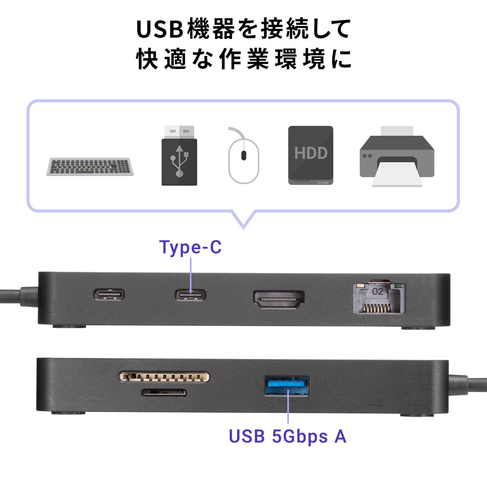 Type-Cケーブル1本でHDMIディスプレイ、各種USBデバイス、有線LAN、SD/microSDの拡張接続ができます。