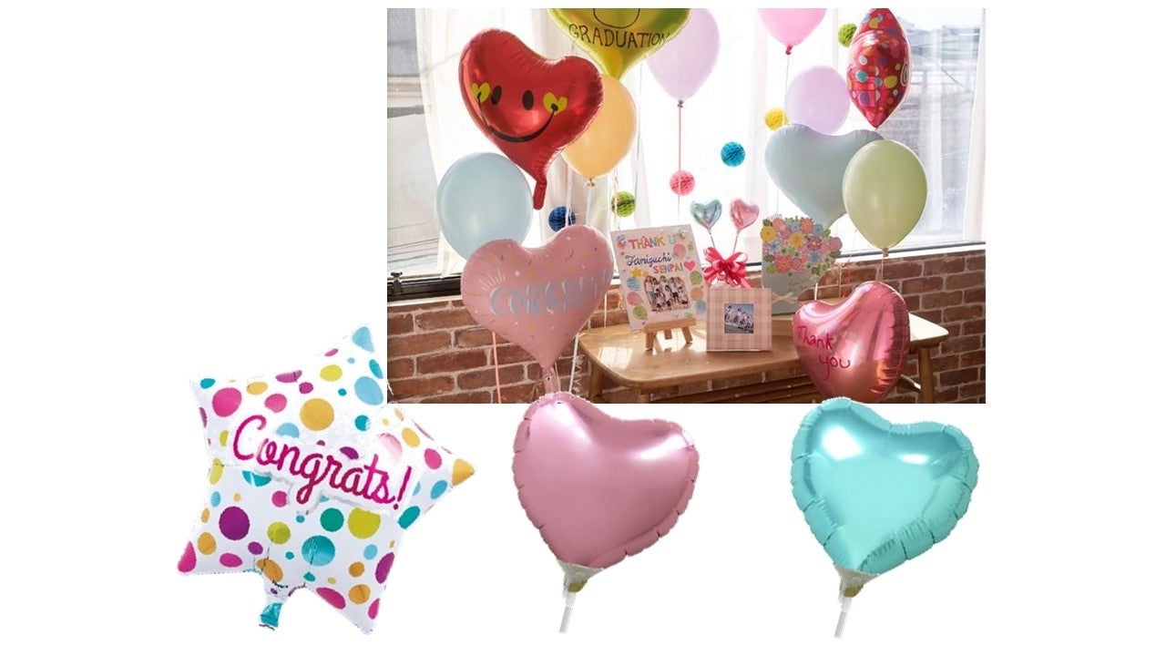 卒業式や歓送迎会を盛り上げたり、プレゼントしたり、気持ちが盛り上がるバルーンアレンジしやすいスティックタイプや、1つでインパクトのあるフィルムタイプなどバリエーション豊富に品揃えします。