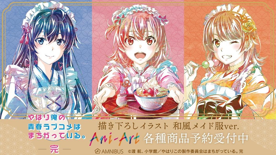 『やはり俺の青春ラブコメはまちがっている。完』の描き下ろしイラスト 和風メイド服ver.商品、アクリルホテルキーホルダーの受注を開始!!アニメ・漫画のオリジナルグッズを販売する「AMNIBUS」にて