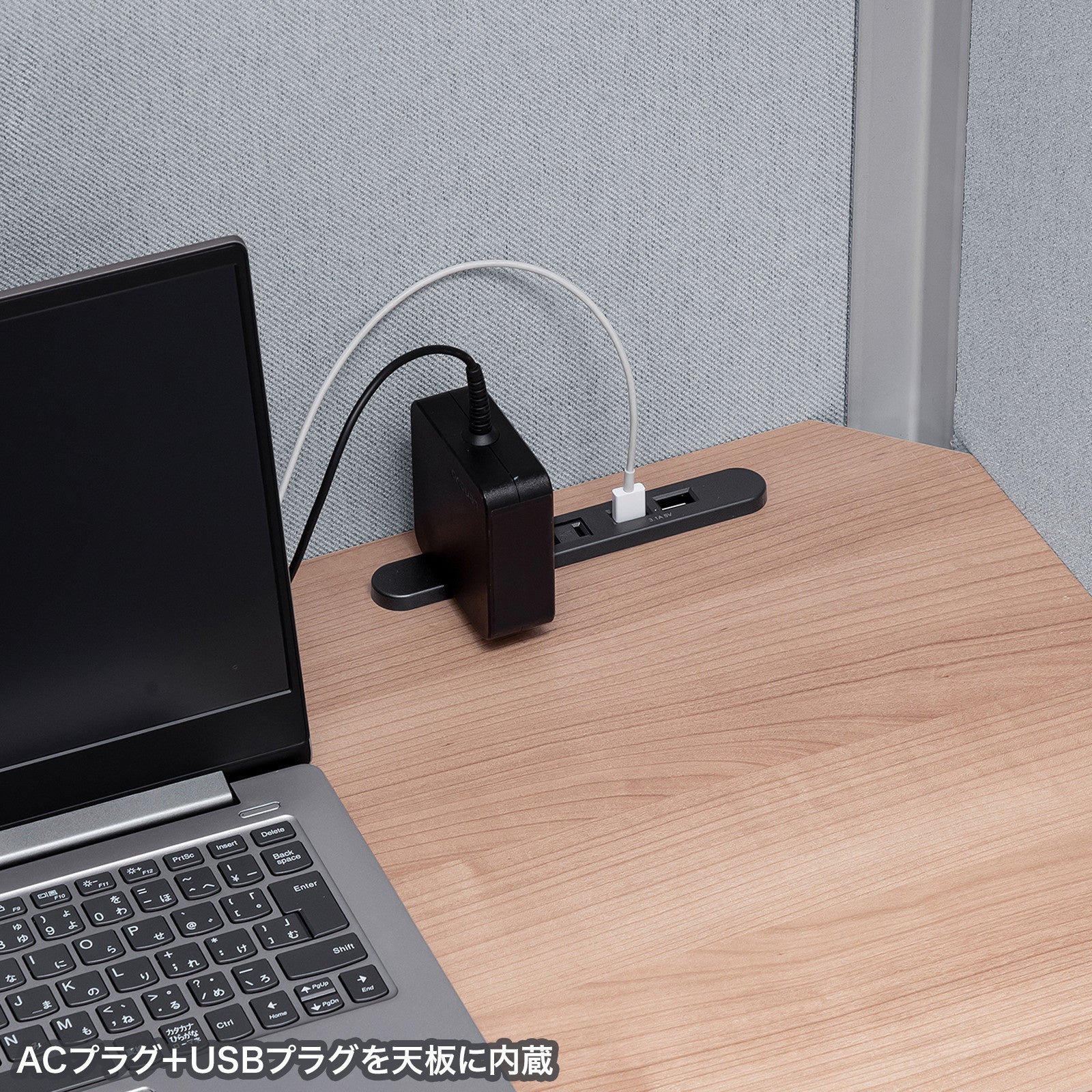 天板にはパソコンの電源やスマホの充電ができるACプラグ+USBプラグが内蔵されており、ノートパソコン以外にも照明や扇風機などが使用できます。壁面にはVESA(75×75・100×100mm)対応のブラケット付きで、液晶モニターが設置可能です。