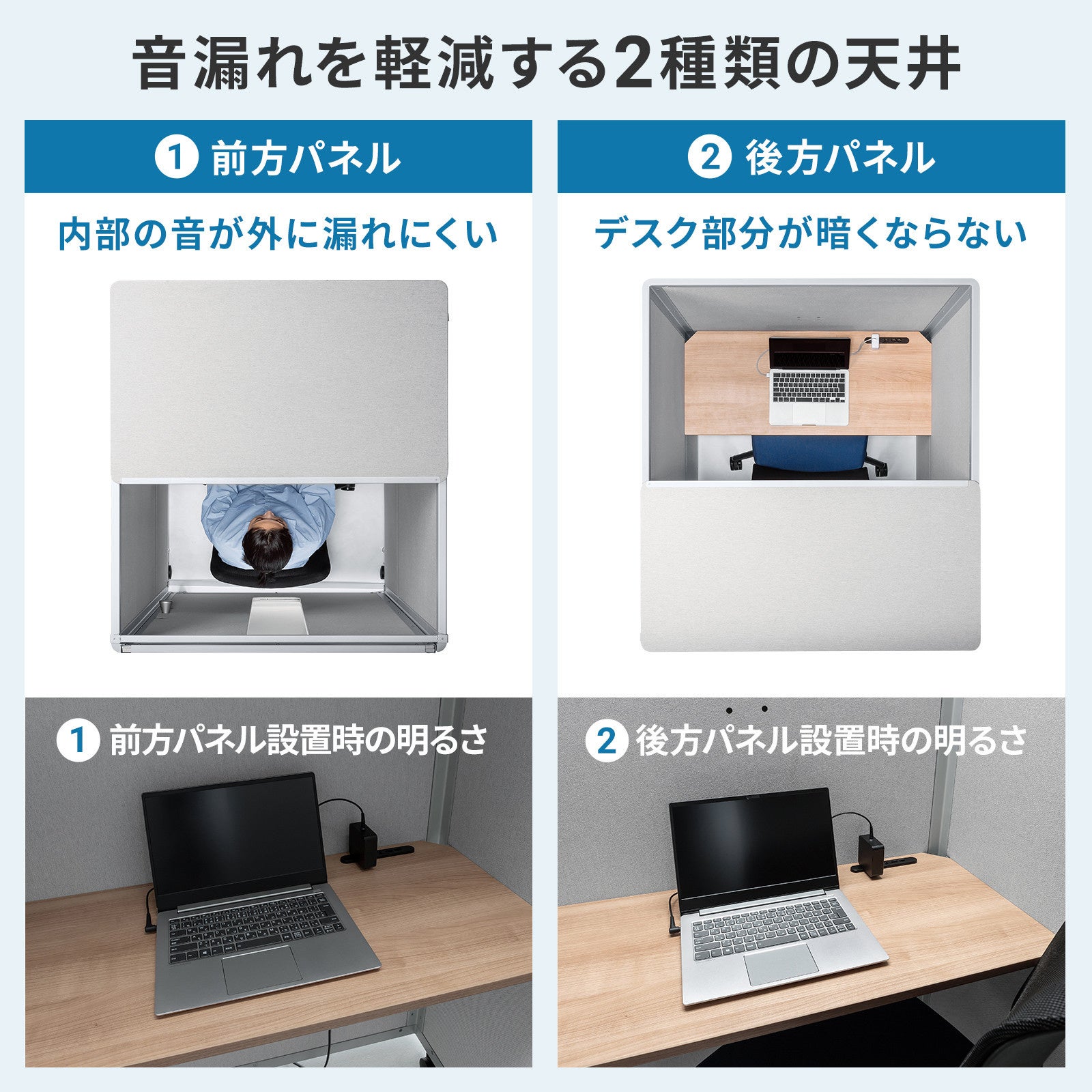 外への音漏れを軽減するはめ込み式天井が2種類付属しています。内部の音をより外へ出しにくくするための前方用パネルと、デスク部をふさがず明るく使える後方用パネルがお好みで設置できます。