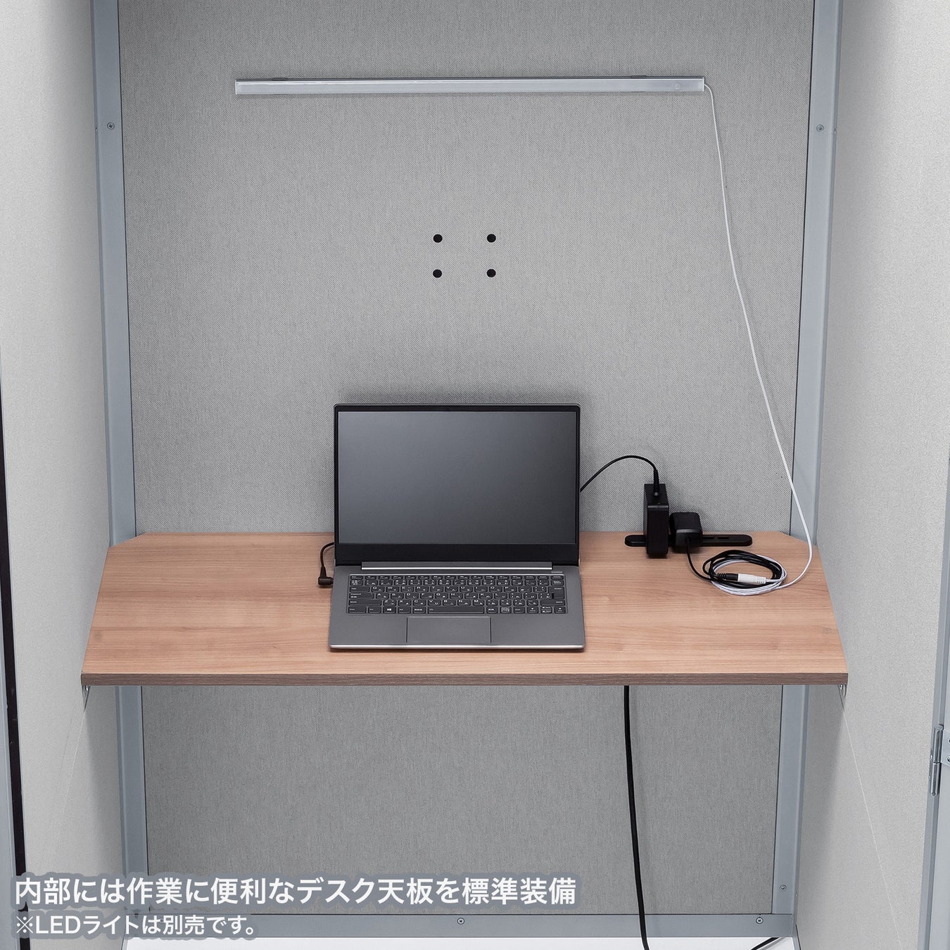 内部には作業ができるデスク天板が標準装備されています。ブースのサイズに合わせたデスクを別途準備する必要はありません。