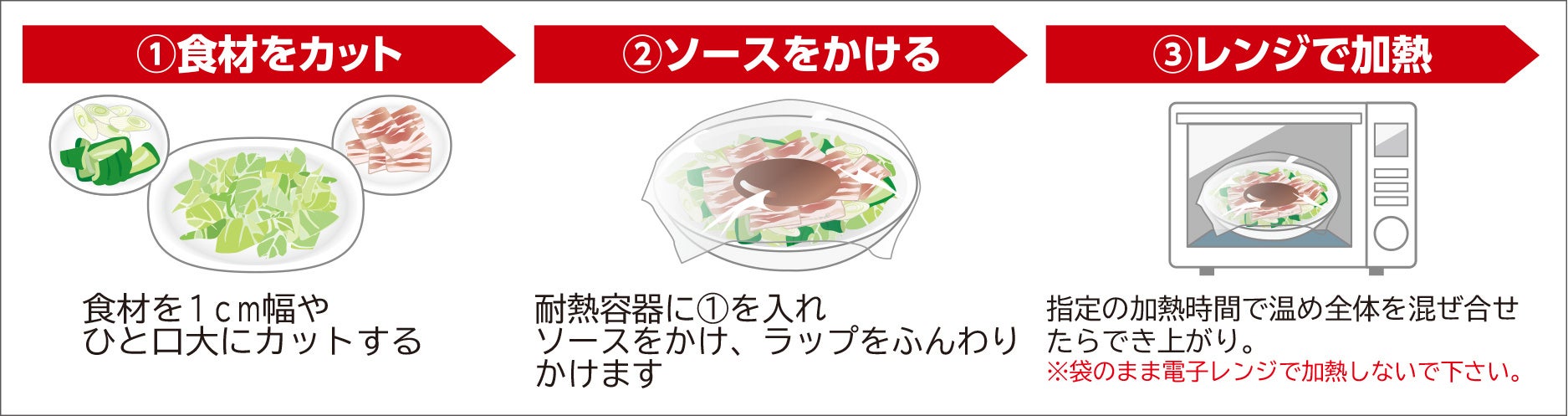 さらに、“油跳ねによりレンジ(コンロ)周りが汚れてしまう”“野菜から出る水分により食感がベタっとする”といった調理時のお悩みに対して、調味料に含まれる油や水分のバランスを調整し、食感を保つ仕様にすることで※4、電子レンジ調理でも、フライパン同等のおいしさを実現しました。