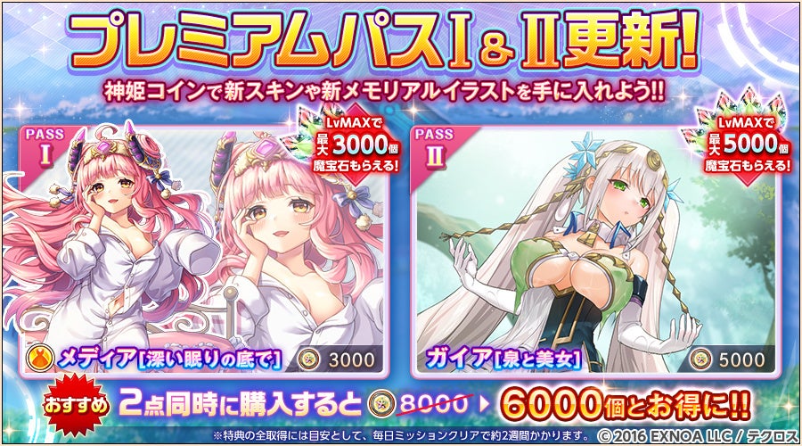 神姫コインで購入できるプレミアムパスⅠ・Ⅱの追加特典には、なんと新たな英霊スキンやメモリアルイラストも!