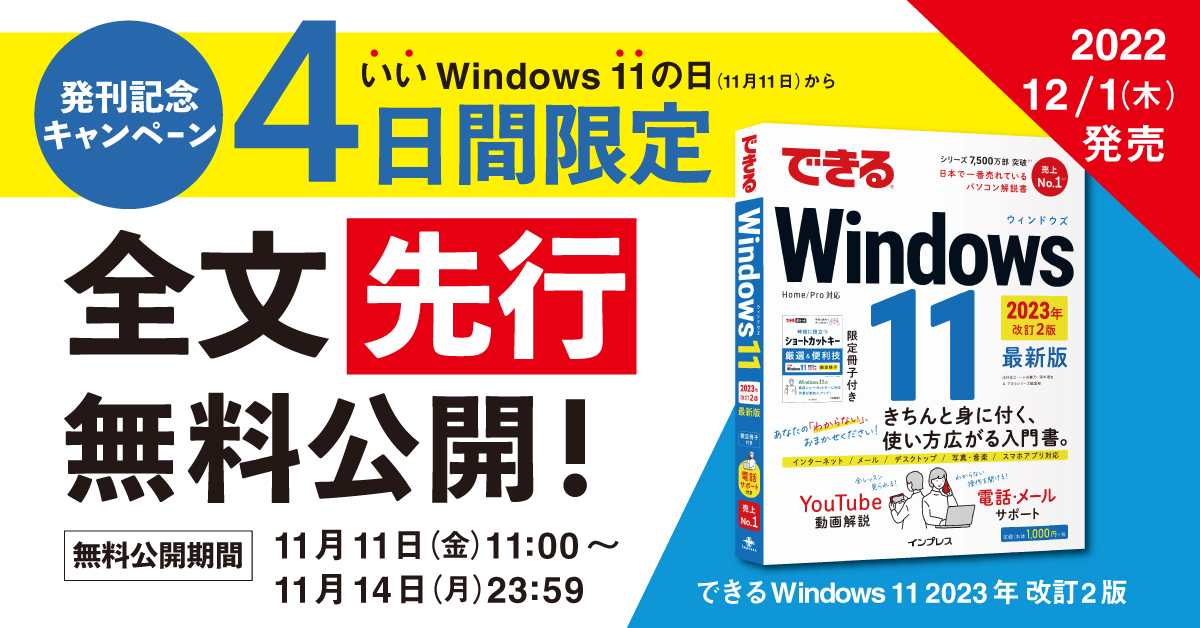 11月11日(金)に「いいWindows 11の日」として、『できるWindows 11 2023年 改訂2版』を発売前に全文先行無料公開!