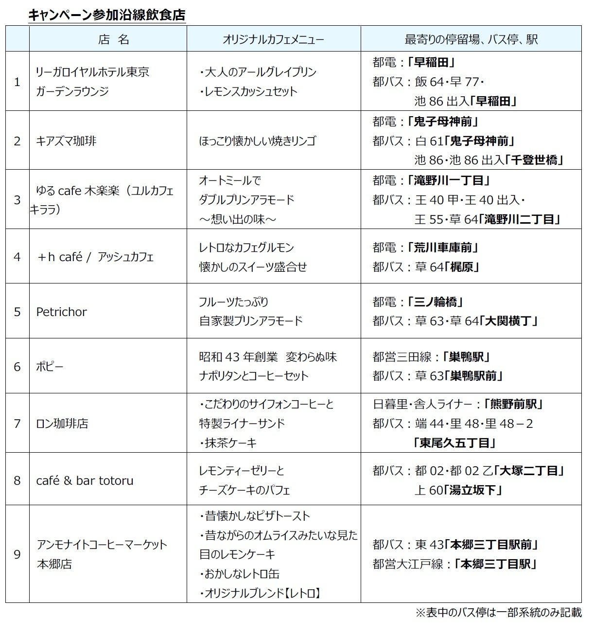 都営交通沿線の9つの飲食店※が本企画のために開発したキャンペーン期間限定のオリジナルカフェメニューについて、都営交通公式SNS(X,Instagram,facebook)、リーフレット、ポスター等で発信するとともに、お店で「冬のぬくもり旅」オリジナルカフェメニューを注文された方には、記念コースターを数量限定でプレゼントします。